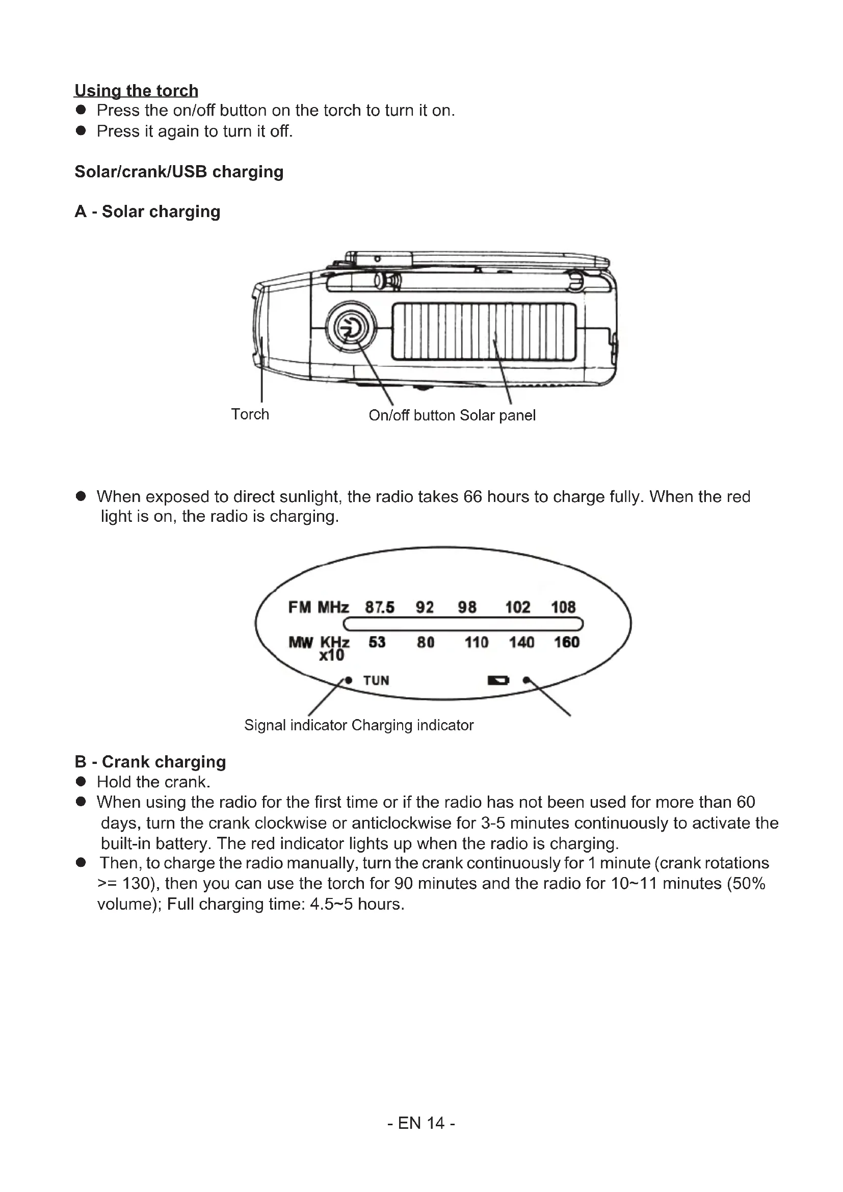 disconnected from the power supply when removing the battery. The lightning bolt symbol within an equilateral triangle alerts users to the presence of dangerous uninsulated electrical voltages inside the device that are rong enough to present a risk of electric shock. The exclamation mark inside a triangle indicates the presence of important operating and maintenance (repair) inructions in the literature accompanying the appliance. Direct current Class II material Alternating current For indoor use only- EN 13 - Functions LED torch FM/AM radio SOS emergency button Emergency phone charger Charging/discharging safety Multi-function charging methods --Crank charging --Solar charging --USB charging IPX3 waterproof protection Instructions Turntheon/obuttonclockwiseandadjuthevolume. ChooseAMorFMradioandangletheradioantennaupwardstoreceiveabettersignal. Turnthetuningdialtochoosetheation.Thesignalindicatorturnsgreenwhentheradio isreceivingasignal. Antenna Charging indicator Signal indicator SOS button Tuning dial Channel selector On/o & Volume +/- Speaker- EN 14 - Using the torch Press the on/o button on the torch to turn it on. Press it again to turn it o. Solar/crank/USB charging A - Solar charging When exposed to direct sunlight, the radio takes 66 hours to charge fully. When the red light is on, the radio is charging. B - Crank charging Hold the crank. When using the radio for the r time or if the radio has not been used for more than 60 days, turn the crank clockwise or anticlockwise for 3-5 minutes continuously to activate the built-in battery. The red indicator lights up when the radio is charging. Then, to charge the radio manually, turn the crank continuously for 1 minute (crank rotations >= 130), then you can use the torch for 90 minutes and the radio for 10~11 minutes (50% volume); Full charging time: 4.5~5 hours. Torch Signal indicator Charging indicator On/o button Solar panel- EN 15 - C - USB charging Plug one end of the USB cable into the C-type input of the radio, plug the other end into a 5V 1A power supply. The red indicator lights up when the radio is charging. Phone charging Open the rubber cover. Connect the phone using a USB cable. The phone charges automatically. It is not necessary to turn the crank. Charging safety When the red charging light ashes, the radio is charging. When the radio is fully charged, the red light is eady. C-type input Standard USB port Removable battery cover- EN 16 - Discharging safety When the battery is overcharged or shorted, the port will automatically op working. When the voltage is lower than 2.5V, the power will automatically cut o. Specifications Dimensions: 128 x 60 x 45 mm Weight: about 300 g Maximum power: 1.5W Frequency: MW: 530~1600 kHz FM: 87.5-108 MHz Operating voltage: 2.7~4.2V Battery: 3.7/2000 mAh Li-ion Maintenance Wipe the radio case with a soft cloth. Use a suitable product for cleaning the lens of the torch. Do not use abrasive tools or solvents to clean the radio. The radio is not completely waterproof, and only has an IPX3 rating. Therefore, do not immerse it in water. When the radio will not be used for more than 60 days or when you use it for the r time, use the solar or hand crank charging for 3-5 minutes to activate the built-in battery. Care for the environment Your product has been designed and manufactured using high-quality materials and components that can be recycled and reused. Attention should be drawn to the environmental aspects of battery disposal. When this crossed-out wheelie bin symbol is applied to a product, it means that the product is covered by European Directive 2002/96/EC. Please nd out about the local separate collection syem for electrical and electronic products. Please act according to your local rules and do not dispose of your old products in your household wae. By ensuring this product is disposed of correctly, you are also helping to prevent potentially negative consequences for the environment and human health. Additional information