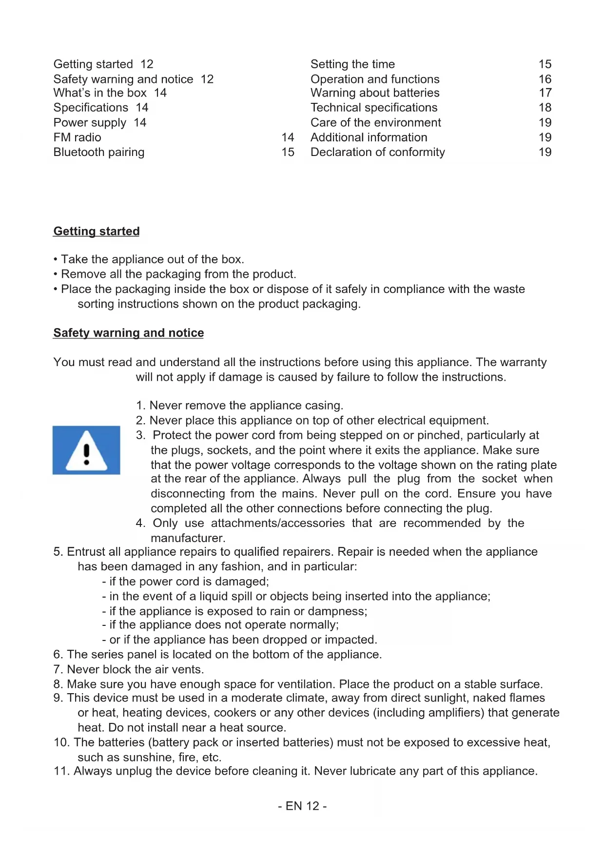 Getting started 12 Safety warning and notice 12 What’s in the box 14 Specications 14 Power supply 14 FM radio 14 Bluetooth pairing 15 Setting the time 15 Operation and functions 16 Warning about batteries 17 Technical specications 18 Care of the environment 19 Additional information 19 Declaration of conformity 19- EN 13 - Clean it with a soft cloth. Do not use abrasive products or harsh cleaners.
