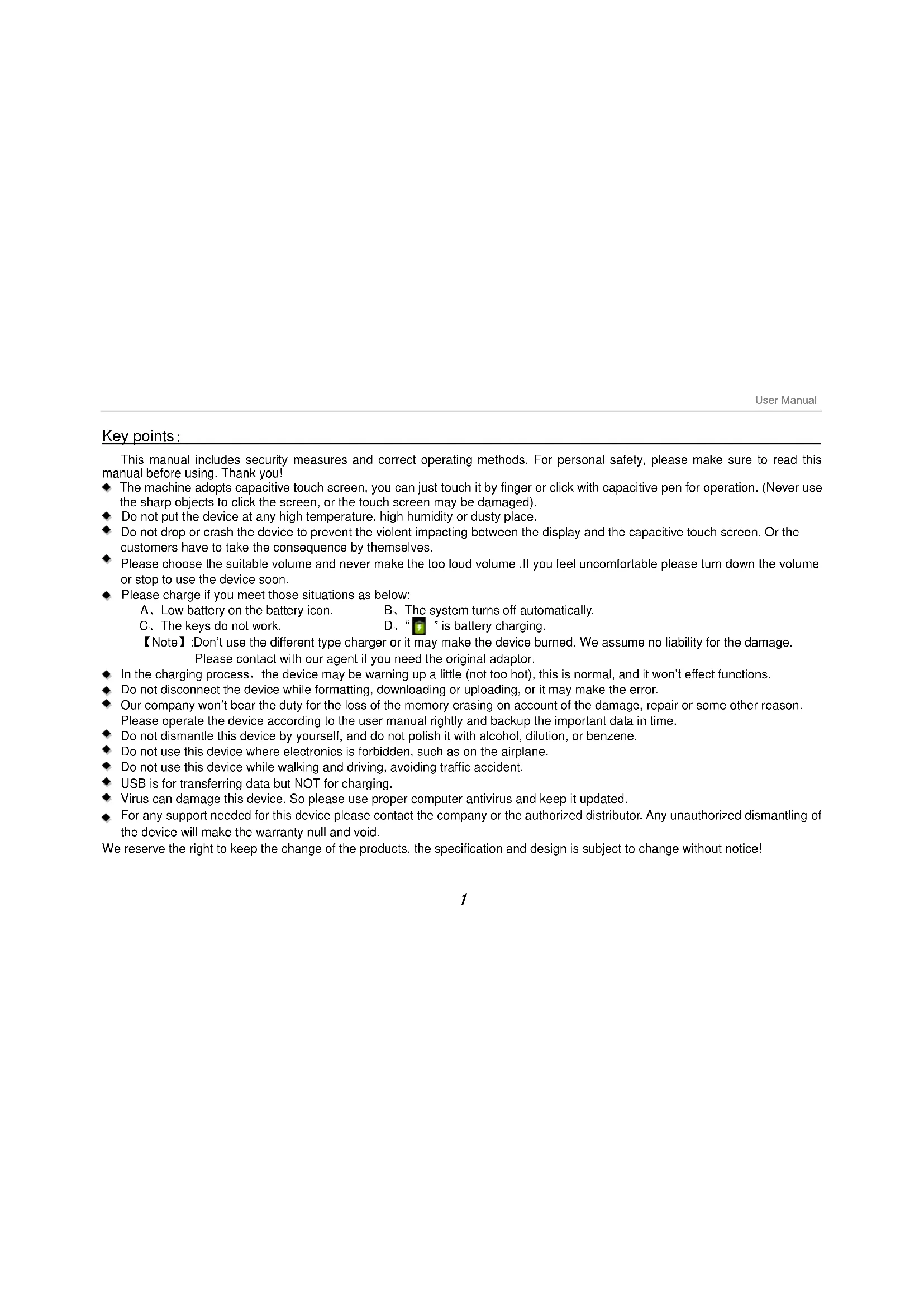 Key points喚 This manual includes security measures and correct operating methods. For personal safety, please make sure to read this manual before using. Thank you! The machine adopts capacitive touch screen, you can just touch it by finger or click with capacitive pen for operation. (Never use the sharp objects to click the screen, or the touch screen may be damaged). Do not put the device at any high temperature, high humidity or dusty place. Do not drop or crash the device to prevent the violent impacting between the display and the capacitive touch screen. Or the customers have to take the consequence by themselves. Please choose the suitable volume and never make the too loud volume .If you feel uncomfortable please turn down the volume or stop to use the device soon. Please charge if you meet those situations as below: AǃLow battery on the battery icon. BǃThe system turns off automatically. CǃThe keys do not work. Dǃ“ ” is battery charging. ǏNoteǐ:Don’t use the different type charger or it may make the device burned. We assume no liability for the damage. Please contact with our agent if you need the original adaptor. In the charging processˈthe device may be warning up a little (not too hot), this is normal, and it won’t effect functions. Do not disconnect the device while formatting, downloading or uploading, or it may make the error. Our company won’t bear the duty for the loss of the memory erasing on account of the damage, repair or some other reason. Please operate the device according to the user manual rightly and backup the important data in time. Do not dismantle this device by yourself, and do not polish it with alcohol, dilution, or benzene. Do not use this device where electronics is forbidden, such as on the airplane. Do not use this device while walking and driving, avoiding traffic accident. USB is for transferring data but NOT for charging. Virus can damage this device. So please use proper computer antivirus and keep it updated. For any support needed for this device please contact the company or the authorized distributor. Any unauthorized dismantling of the device will make the warranty null and void. We reserve the right to keep the change of the products, the specification and design is subject to change without notice!240V 50/60Hz 0.4A USB Cable Packing List: Please check box for the following items