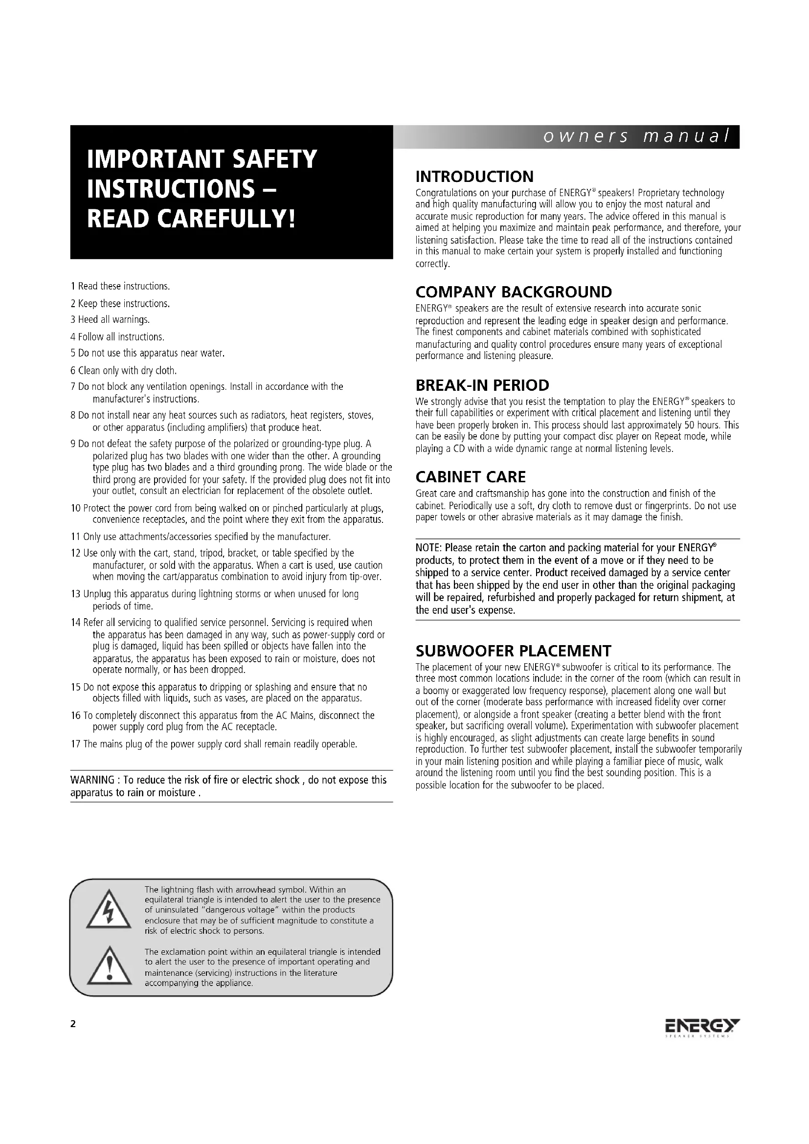 speakers to their full capabilities or experiment with critical placement and listening until they have been properly broken in. This process should last approximately 50 hours. This can be easily be done by putting your compact disc player on Repeat mode, while playing a CD with a wide dynamic range at normal listening levels. CABINET CARE Great care and craftsmanship has gone into the construction and finish of the cabinet. Periodically use a soft, dry cloth to remove dust or fingerprints. Do not use paper towels or other abrasive materials as it may damage the finish. NOTE: Please retain the carton and packing material for your ENERGY