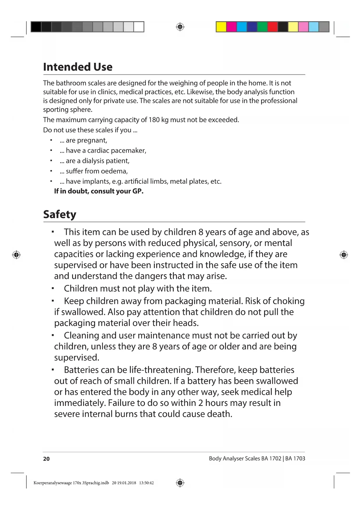 Body Analyser Scales BA 1702 | BA 1703 Intended Use The bathroom scales are designed for the weighing of people in the home. It is not suitable for use in clinics, medical practices, etc. Likewise, the body analysis function is designed only for private use. The scales are not suitable for use in the professional sporting sphere. The maximum carrying capacity of 180 kg must not be exceeded. Do not use these scales if you ... ... are pregnant, ... have a cardiac pacemaker, ... are a dialysis patient, ... suer from oedema, ... have implants, e.g. articial limbs, metal plates, etc. If in doubt, consult your GP. Safety This item can be used by children 8 years of age and above, as well as by persons with reduced physical, sensory, or mental capacities or lacking experience and knowledge, if they are supervised or have been instructed in the safe use of the item and understand the dangers that may arise. Children must not play with the item. Keep children away from packaging material. Risk of choking if swallowed. Also pay attention that children do not pull the packaging material over their heads. Cleaning and user maintenance must not be carried out by children, unless they are 8 years of age or older and are being supervised. Batteries can be life-threatening. Therefore, keep batteries out of reach of small children. If a battery has been swallowed or has entered the body in any other way, seek medical help immediately. Failure to do so within 2 hours may result in severe internal burns that could cause death. Koerperanalysewaage 170x 3Sprachig.indb 20 19.01.2018 13:50:42Safety