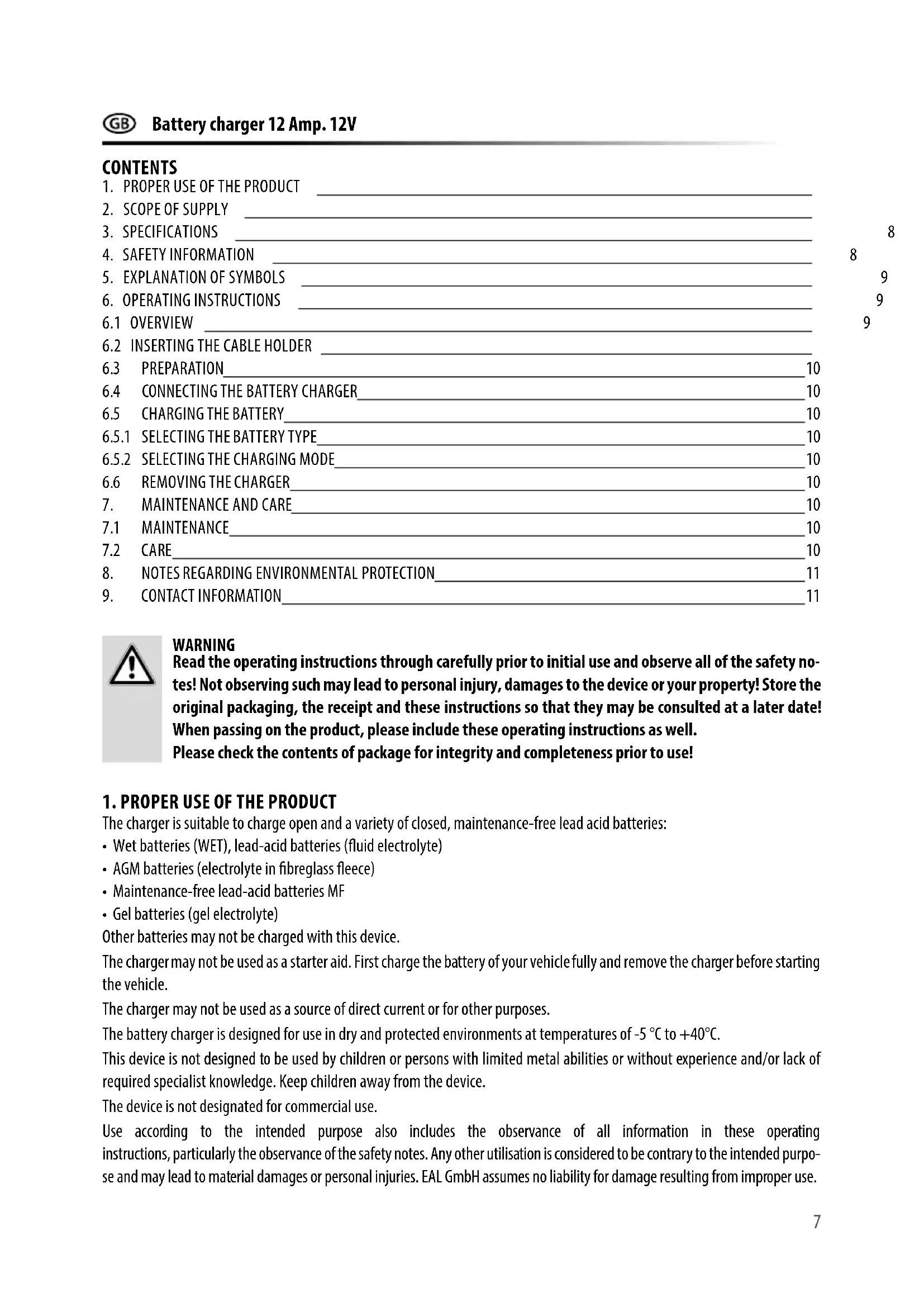 - Gel batteries (gel electrolyte) Other batteries may not be charged with this device. The charger may not be used as a starter aid. First charge the battery of your vehicle fully and remove the charger before starting the vehicle. The charger may not be used as a source of direct current or for other purposes. The battery charger is designed for use in dry and protected environments at temperatures of -5 °C to +40°C. This device is not designed to be used by children or persons with limited metal abilities or without experience and/or lack of required specialist knowledge. Keep children away from the device. The device is not designated for commercial use. Use according to the intended purpose also includes the observance of all information in these operating instructions, particularly the observance of the safety notes. Any other utilisation is considered to be contrary to the intended purpo- se and may lead to material damages or personal injuries. EAL GmbH assumes no liability for damage resulting from improper use.