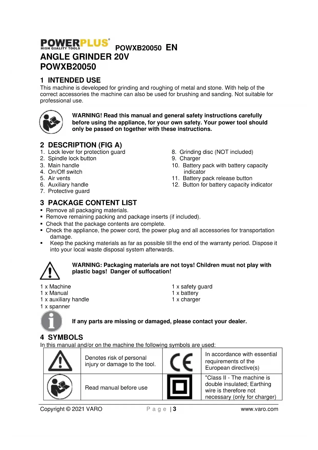 "Class II - The machine is double insulated; Earthing wire is therefore not necessary (only for charger)POWXB20050 EN Copyright © 2021 VARO P a g e | 4 www.varo.com