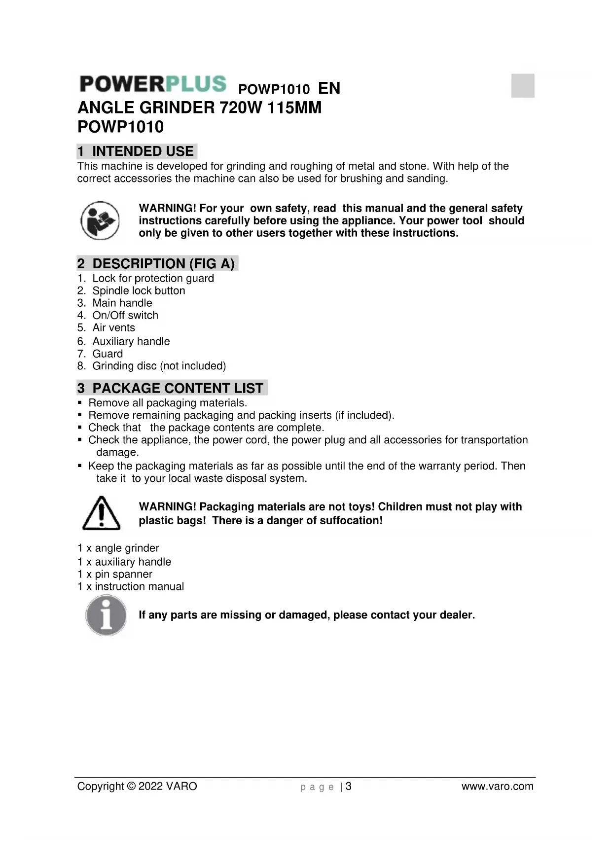 - Keep the packaging materials as far as possible until the end of the warranty period. Then take it to your local waste disposal system. WARNING! Packaging materials are not toys! Children must not play with plastic bags! There is a danger of suffocation! 1 x angle grinder 1 x auxiliary handle 1 x pin spanner 1 x instruction manual If any parts are missing or damaged, please contact your dealer.POWP1010 EN Copyright © 2022 VARO p a g e | 4 www.varo.com 4 SYMBOLS In this manual and/or on the machine the following symbols are used: