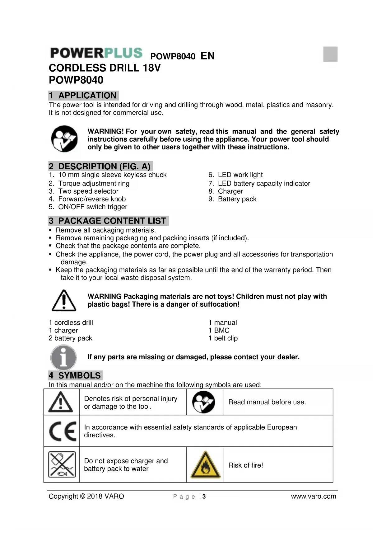 VARO N.V. - Joseph Van Instraat 9 - BE2500 Lier - BELGIUM, declares that, Product: Drill – Battery operated trade mark: POWERplus model : POWP8040 is in conformity with the essential requirements and other relevant provisions of the applicable European Directives, based on the application of European harmonized standards. Any unauthorized modification of the apparatus voids this declaration. European Directives (including, if applicable, their amendments up to the date of signature); 2014/30/EU 2006/42/EC 2011/65/EU European harmonized standards (including, if applicable, their amendments up to the date of signature); EN60745-1 : 2009 EN60745-2-1 : 2010 EN60745-2-2 : 2010 EN55014-1 : 2006 EN55014-2 : 2015 Keeper of the Technical Documentation : Philippe Vankerkhove, VARO – Vic. Van Rompuy N.V. The undersigned acts on behalf of the company CEO, Hugo Cuypers Regulatory Affairs – Compliance Manager Date : 17/01/2018POWP8040 DE Copyright © 2018 VARO S e i t e | 1 www.varo.com 1 EINSATZBEREICH ......................................................................... 3