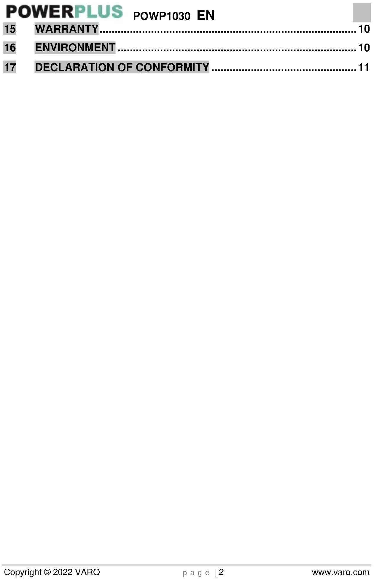 - Don’t keep it in plastic bags to avoid humidity build-up.POWP1030 EN Copyright © 2022 VARO p a g e | 10 www.varo.com 15 WARRANTY