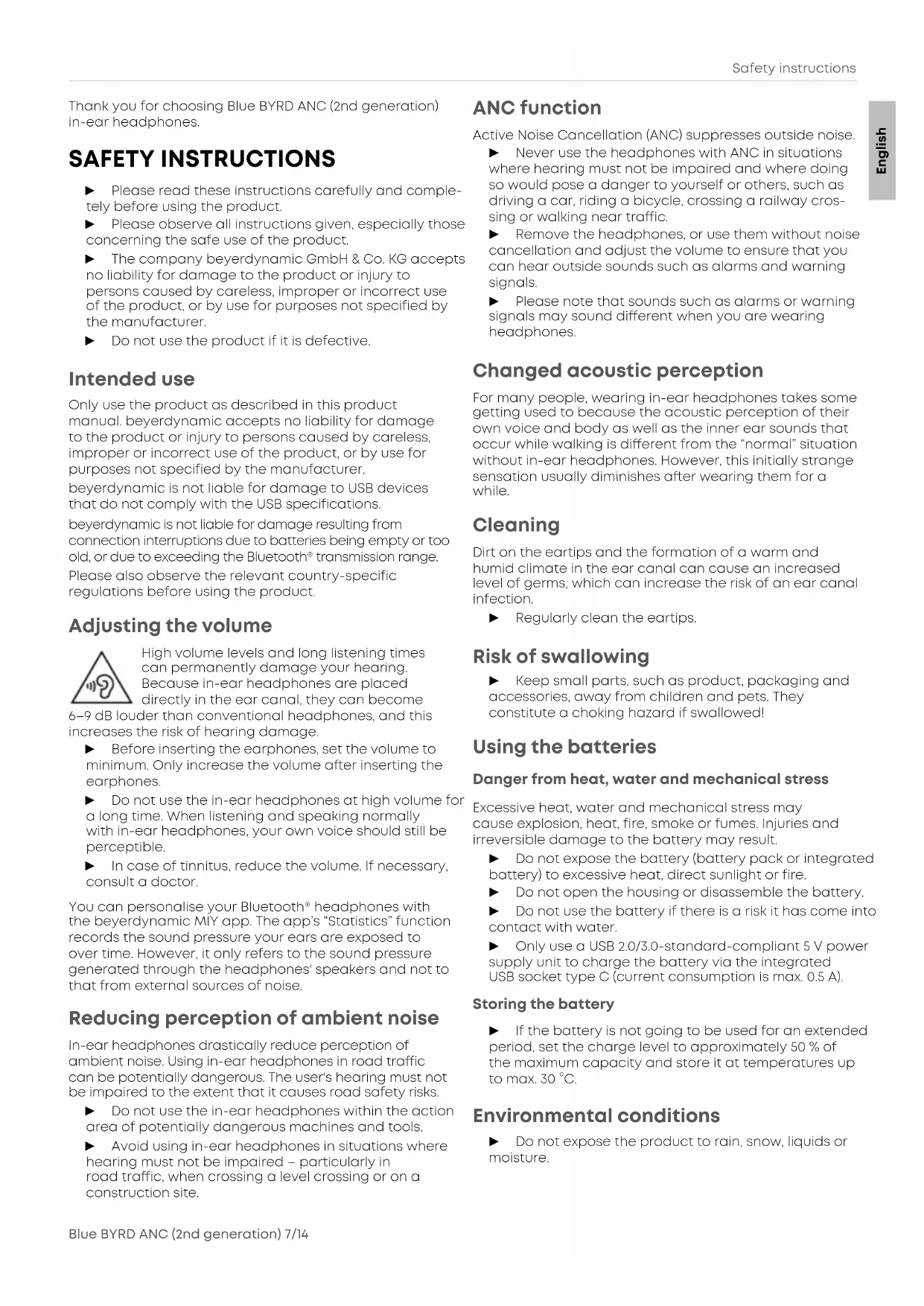 FCC / IC REGULATION ..................................13Safety inructions Blue BYRD ANC (2nd generation) 7/14 Thank you for choosing Blue BYRD ANC (2nd generation) in-ear headphones. SAFETY INSTRUCTIONS ► Please read these inructions carefully and comple- tely before using the product. ► Please observe all inructions given, especially those concerning the safe use of the product. ► The company beyerdynamic GmbH & Co. KG accepts no liability for damage to the product or injury to persons caused by careless, improper or incorrect use of the product, or by use for purposes not specified by the manufacturer. ► Do not use the product if it is defective. Intended use Only use the product as described in this product manual. beyerdynamic accepts no liability for damage to the product or injury to persons caused by careless, improper or incorrect use of the product, or by use for purposes not specified by the manufacturer. beyerdynamic is not liable for damage to USB devices that do not comply with the USB specifications. beyerdynamic is not liable for damage resulting from connection interruptions due to batteries being empty or too old, or due to exceeding the Bluetooth® transmission range. Please also observe the relevant country-specific regulations before using the product. Adjuing the volume High volume levels and long liening times can permanently damage your hearing. Because in-ear headphones are placed directly in the ear canal, they can become 6–9dB louder than conventional headphones, and this increases the risk of hearing damage. ► Before inseing the earphones, set the volume to minimum. Only increase the volume aer inseing the earphones. ► Do not use the in-ear headphones at high volume for a long time. When liening and speaking normally with in-ear headphones, your own voice should ill be perceptible. ► In case of tinnitus, reduce the volume. If necessary, consult a doctor. You can personalise your Bluetooth® headphones with the beyerdynamic MIY app. The app’s “Statiics” function records the sound pressure your ears are exposed to over time. However, it only refers to the sound pressure generated through the headphones' speakers and not to that from external sources of noise. Reducing perception of ambient noise In-ear headphones draically reduce perception of ambient noise. Using in-ear headphones in road traic can be potentially dangerous. The user's hearing mu not be impaired to the extent that it causes road safety risks. ► Do not use the in-ear headphones within the action area of potentially dangerous machines and tools. ► Avoid using in-ear headphones in situations where hearing mu not be impaired – paicularly in road traic, when crossing a level crossing or on a conruction site. ANC function Active Noise Cancellation (ANC) suppresses outside noise. ► Never use the headphones with ANC in situations where hearing mu not be impaired and where doing so would pose a danger to yourself or others, such as driving a car, riding a bicycle, crossing a railway cros- sing or walking near traic. ► Remove the headphones, or use them without noise cancellation and adju the volume to ensure that you can hear outside sounds such as alarms and warning signals. ► Please note that sounds such as alarms or warning signals may sound dierent when you are wearing headphones. Changed acouic perception For many people, wearing in-ear headphones takes some getting used to because the acouic perception of their own voice and body as well as the inner ear sounds that occur while walking is dierent from the “normal” situation without in-ear headphones. However, this initially range sensation usually diminishes aer wearing them for a while. Cleaning Di on the eaips and the formation of a warm and humid climate in the ear canal can cause an increased level of germs, which can increase the risk of an ear canal infection. ► Regularly clean the eaips. Risk of swallowing ► Keep small pas, such as product, packaging and accessories, away from children and pets. They conitute a choking hazard if swallowed! Using the batteries Danger from heat, water and mechanical ress Excessive heat, water and mechanical ress may cause explosion, heat, fire, smoke or fumes. Injuries and irreversible damage to the battery may result. ► Do not expose the battery (battery pack or integrated battery) to excessive heat, direct sunlight or fire. ► Do not open the housing or disassemble the battery. ► Do not use the battery if there is a risk it has come into contact with water. ► Only use a USB2.0/3.0-andard-compliant 5V power supply unit to charge the battery via the integrated USB socket type C (current consumption is max. 0.5A). Storing the battery ► If the battery is not going to be used for an extended period, set the charge level to approximately 50% of the maximum capacity and ore it at temperatures up to max. 30°C. Environmental conditions ► Do not expose the product to rain, snow, liquids or moiure. EnglishABOUT THIS MANUAL 8/14 Blue BYRD ANC (2nd generation)
