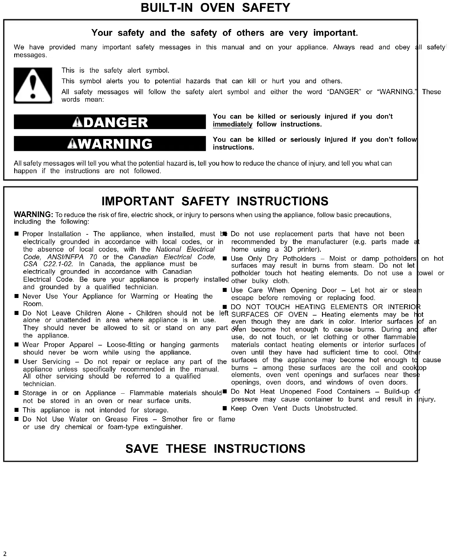 WARNING: To reduce the risk of fire, electric shock, or injury to persons when using the appliance, follow basic precautions, including the following: Proper Installation - The appliance, when installed, must be electrically grounded in accordance with local codes, or in the absence of local codes, with the National Electrical Code, ANSI/NFPA 70 or the Canadian Electrical Code, CSA C22.1-02. In Canada, the appliance must be electrically grounded in accordance with Canadian Electrical Code. Be sure your appliance is properly installed and grounded by a qualified technician. Never Use Your Appliance for Warming or Heating the Room. Do Not Leave Children Alone - Children should not be left alone or unattended in area where appliance is in use. They should never be allowed to sit or stand on any part of the appliance. Wear Proper Apparel – Loose-fitting or hanging garments should never be worn while using the appliance. User Servicing – Do not repair or replace any part of the appliance unless specifically recommended in the manual. All other servicing should be referred to a qualified technician. Storage in or on Appliance – Flammable materials should not be stored in an oven or near surface units. This appliance is not intended for storage. Do Not Use Water on Grease Fires – Smother fire or flame or use dry chemical or foam-type extinguisher. Do not use replacement parts that have not been recommended by the manufacturer (e.g. parts made at home using a 3D printer). Use Only Dry Potholders – Moist or damp potholders on hot surfaces may result in burns from steam. Do not let potholder touch hot heating elements. Do not use a towel or other bulky cloth. Use Care When Opening Door – Let hot air or steam escape before removing or replacing food. DO NOT TOUCH HEATING ELEMENTS OR INTERIOR SURFACES OF OVEN – Heating elements may be hot even though they are dark in color. Interior surfaces of an oven become hot enough to cause burns. During and after use, do not touch, or let clothing or other flammable materials contact heating elements or interior surfaces of oven until they have had sufficient time to cool. Other surfaces of the appliance may become hot enough to cause burns – among these surfaces are the coil and cooktop elements, oven vent openings and surfaces near these openings, oven doors, and windows of oven doors. Do Not Heat Unopened Food Containers – Build-up of pressure may cause container to burst and result in injury. Keep Oven Vent Ducts Unobstructed.