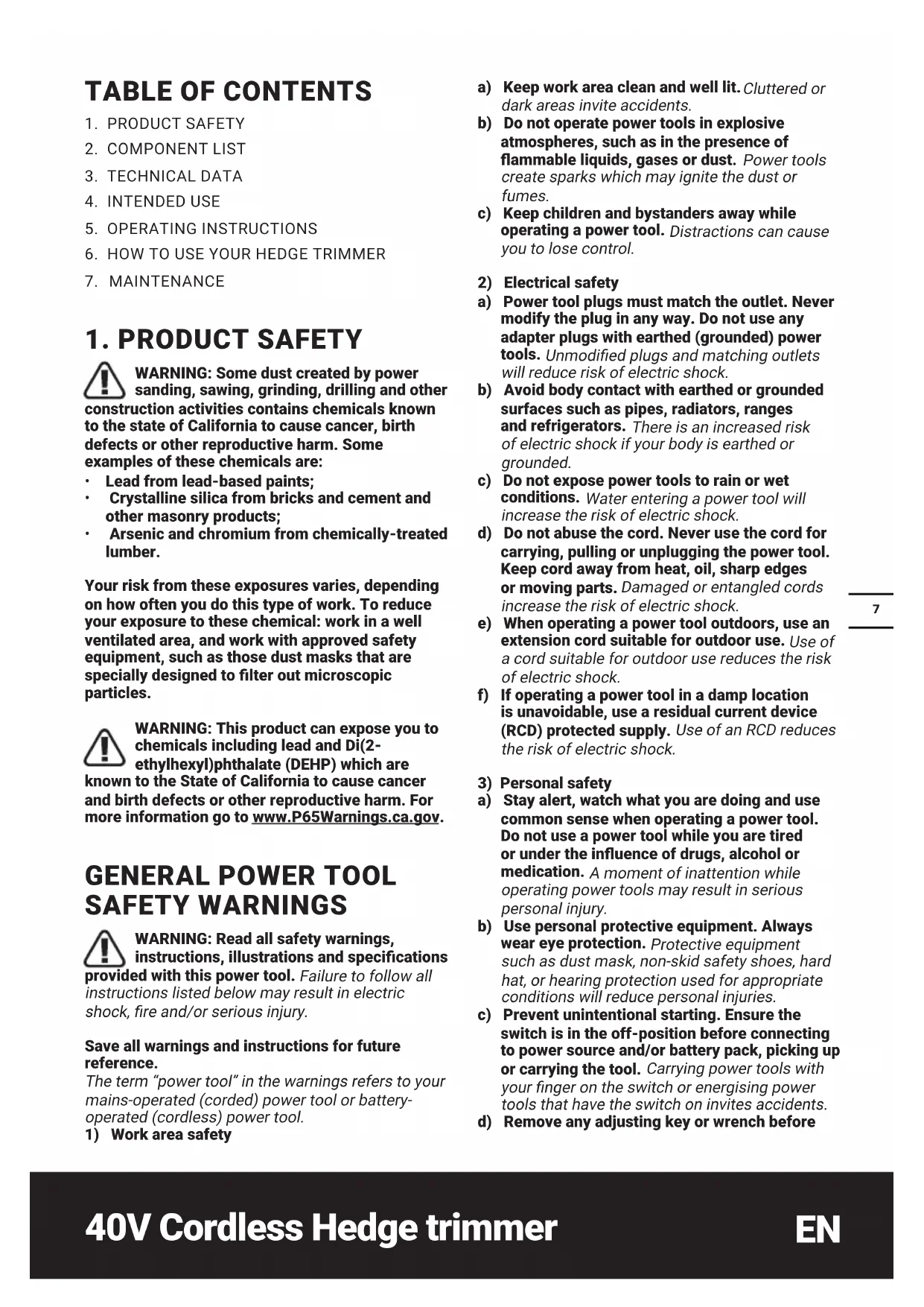 WARNINGS a) Keep all parts of the body away from the blade. Do not remove cut material or hold material to be cut when blades are moving. Blades continue to move after the switch is turned off. A moment of inattention while operating the9 40V Cordless Hedge trimmer