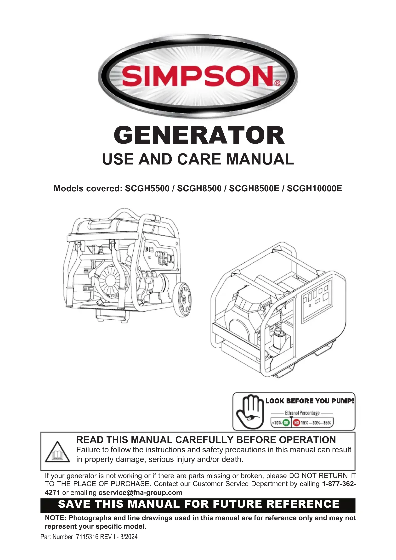 Failure to follow the instructions and safety precautions in this manual can result in property damage, serious injury and/or death.NOTE: Photographs and line drawings used in this manual are for reference only and may not represent your specic model.If your generator is not working or if there are parts missing or broken, please DO NOT RETURN IT TO THE PLACE OF PURCHASE. Contact our Customer Service Department by calling 1-877-362-4271 or emailing cservice@fna-group.comLOOK BEFORE YOU PUMP!Page II NOTES This product and the engine exhaust can expose you to chemicals which are known to the state of California to cause cancer, birth defects, or other reproductive harm. For more information on California Proposition 65, go to www.P65Warnings.ca.gov.