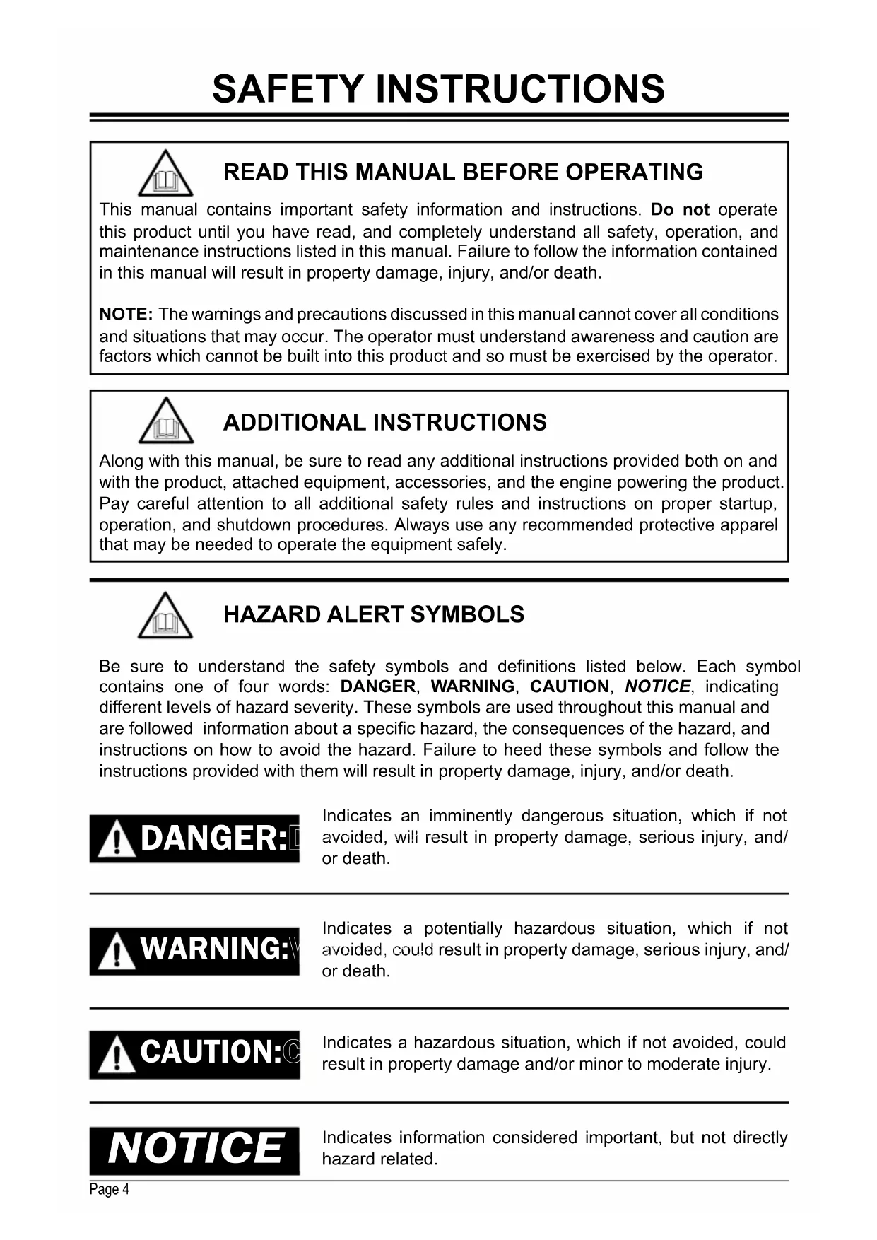 PUMP GUARD 31WARRANTYPage 4 CAUTION:CAUTION: NOTICE This manual contains important safety information and instructions. Do not operate this product until you have read, and completely understand all safety, operation, and maintenance instructions listed in this manual. Failure to follow the information contained in this manual will result in property damage, injury, and/or death.NOTE: The warnings and precautions discussed in this manual cannot cover all conditions and situations that may occur. The operator must understand awareness and caution are factors which cannot be built into this product and so must be exercised by the operator.READ THIS MANUAL BEFORE OPERATINGADDITIONAL INSTRUCTIONSBe sure to understand the safety symbols and denitions listed below. Each symbol contains one of four words: DANGER, WARNING, CAUTION, NOTICE, indicating dierent levels of hazard severity. These symbols are used throughout this manual and are followed information about a specic hazard, the consequences of the hazard, and instructions on how to avoid the hazard. Failure to heed these symbols and follow the instructions provided with them will result in property damage, injury, and/or death.HAZARD ALERT SYMBOLSIndicates an imminently dangerous situation, which if not avoided, will result in property damage, serious injury, and/or death.Indicates a potentially hazardous situation, which if not avoided, could result in property damage, serious injury, and/ or death.Indicates a hazardous situation, which if not avoided, could result in property damage and/or minor to moderate injury.Indicates information considered important, but not directly hazard related. SAFETY INSTRUCTIONS Along with this manual, be sure to read any additional instructions provided both on and with the product, attached equipment, accessories, and the engine powering the product. Pay careful attention to all additional safety rules and instructions on proper startup, operation, and shutdown procedures. Always use any recommended protective apparel that may be needed to operate the equipment safely.