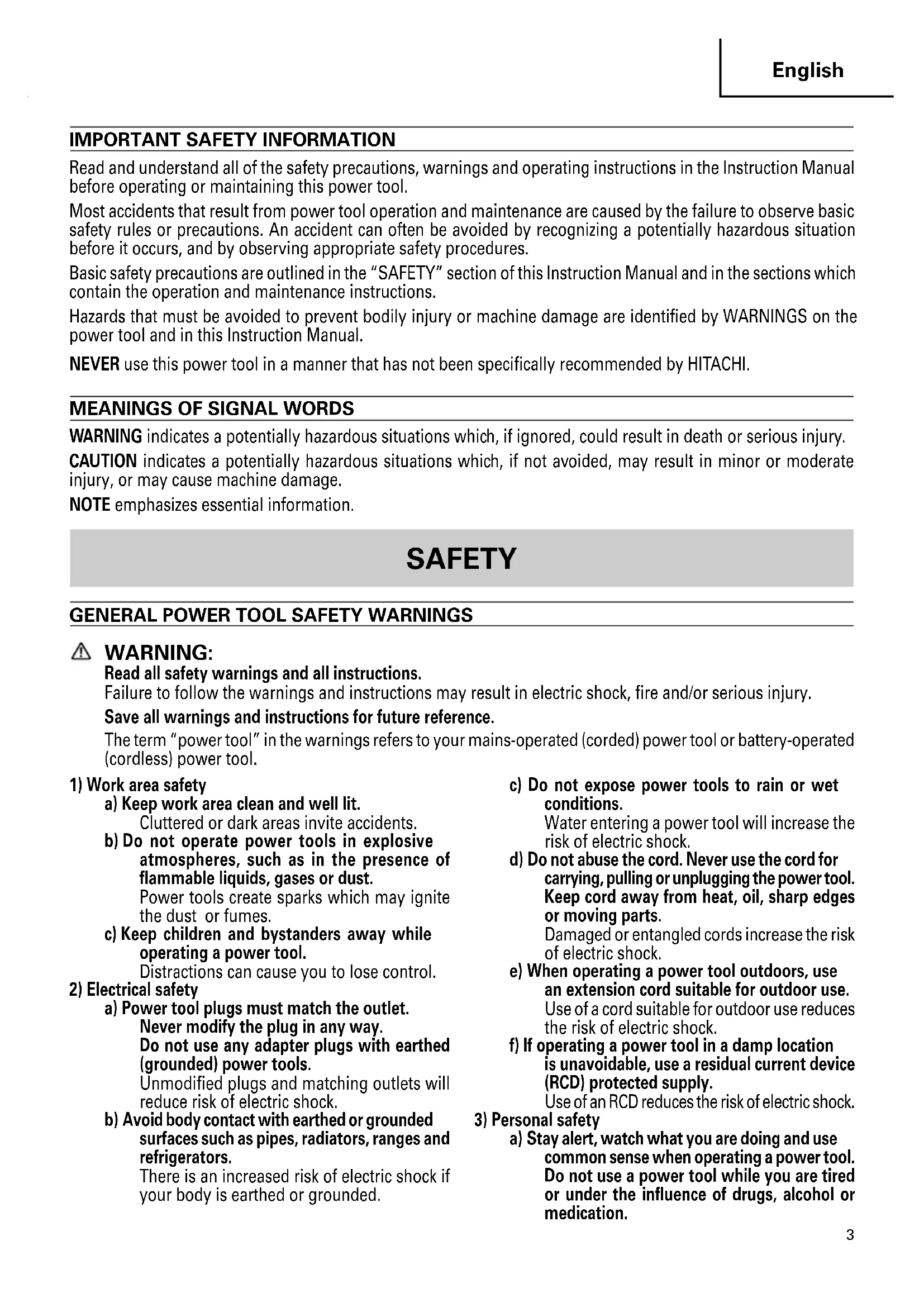 Read and understand all of the safety precautions, warnings and operating instructions in the Instruction Manual before operating or maintaining this power tool. Most accidents that result from power tool operation and maintenance are caused by the failure to observe basic safety rules or precautions. An accident can often be avoided by recognizing a potentially hazardous situation before it occurs, and by observing appropriate safety procedures. Basic safety precautions are outlined in the “SAFETY” section of this Instruction Manual and in the sections which contain the operation and maintenance instructions. Hazards that must be avoided to prevent bodily injury or machine damage are identified by WARNINGS on the power tool and in this Instruction Manual. NEVER use this power tool in a manner that has not been specifically recommended by HITACHI.