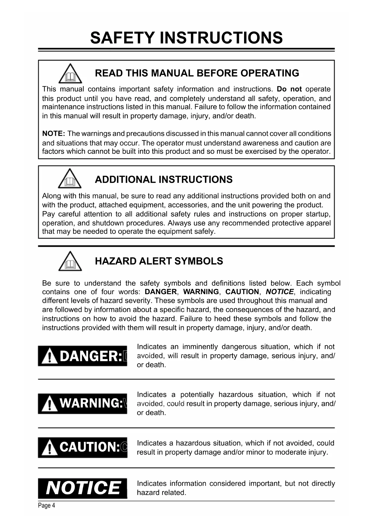 Hazard Alert Symbols Additional Instructions Read this Manual Before Operating SAFETY INSTRUCTIONS