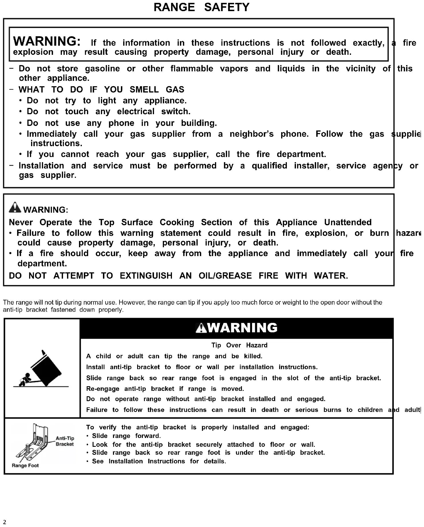 - If a fire should occur, keep away from the appliance and immediately call your fire department. DO NOT ATTEMPT TO EXTINGUISH AN OIL/GREASE FIRE WITH WATER. The range will not tip during normal use. However, the range can tip if you apply too much force or weight to the open door without the anti-tip bracket fastened down properly. WARNING Tip Over Hazard A child or adult can tip the range and be killed. Install anti-tip bracket to floor or wall per installation instructions. Slide range back so rear range foot is engaged in the slot of the anti-tip bracket. Re-engage anti-tip bracket if range is moved. Do not operate range without anti-tip bracket installed and engaged. Failure to follow these instructions can result in death or serious burns to children and adults. To verify the anti-tip bracket is properly installed and engaged: