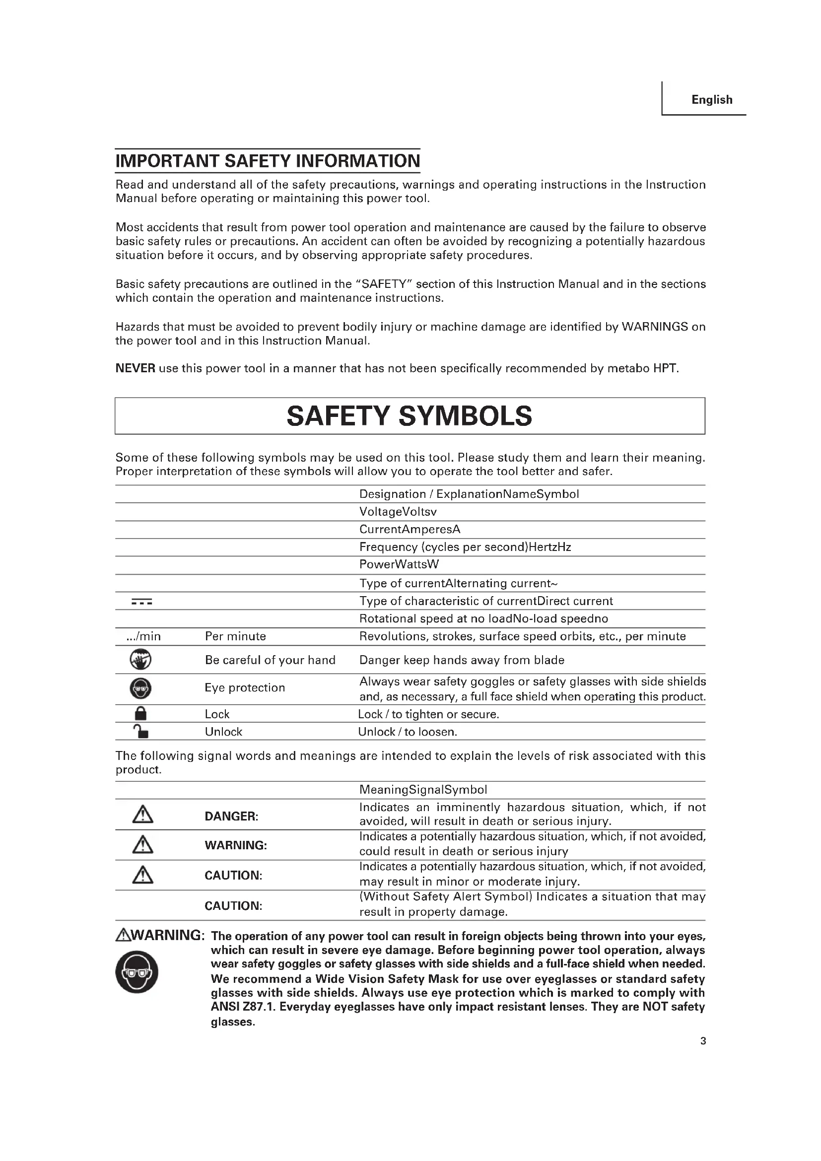 Indicates a potentially hazardous situation, which, if not avoided, may result in minor or moderate injury. CAUTION: (Without Safety Alert Symbol) Indicates a situation that may result in property damage. CAUTION: Type of currentAlternating current~ Type of characteristic of currentDirect current Rotational speed at no loadNo-load speedno Revolutions, strokes, surface speed orbits, etc., per minutePer minute.../min Danger keep hands away from bladeBe careful of your hand Eye protection SAFETY SYMBOLS Lock Lock / to tighten or secure. Unlock Unlock / to loosen.4 English SAFETY INSTRUCTIONS