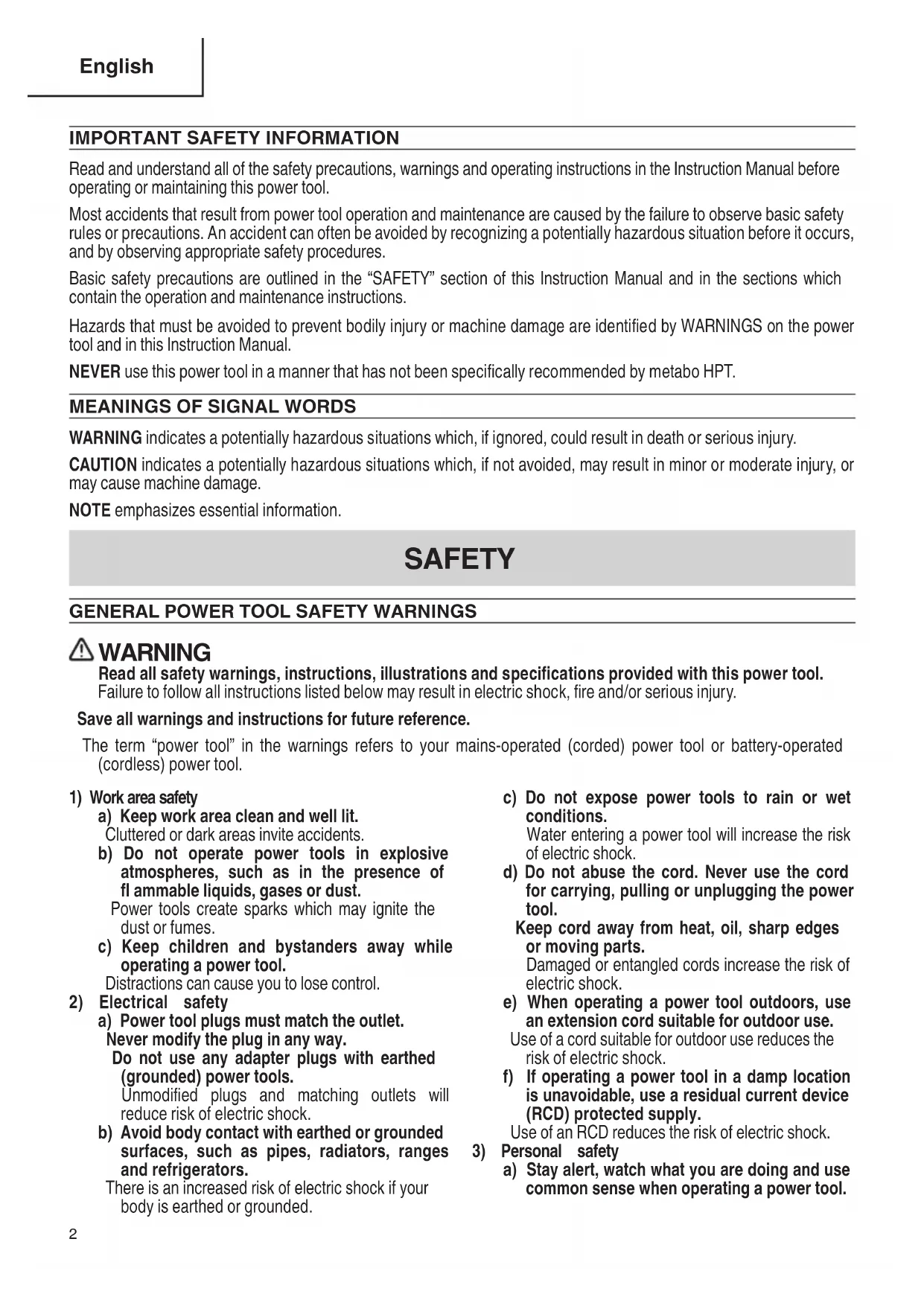 Read and understand all of the safety precautions, warnings and operating instructions in the Instruction Manual before operating or maintaining this power tool. Most accidents that result from power tool operation and maintenance are caused by the failure to observe basic safety rules or precautions. An accident can often be avoided by recognizing a potentially hazardous situation before it occurs, and by observing appropriate safety procedures. Basic safety precautions are outlined in the “SAFETY” section of this Instruction Manual and in the sections which contain the operation and maintenance instructions. Hazards that must be avoided to prevent bodily injury or machine damage are identifi ed by WARNINGS on the power tool and in this Instruction Manual. NEVER use this power tool in a manner that has not been specifi cally recommended by metabo HPT.