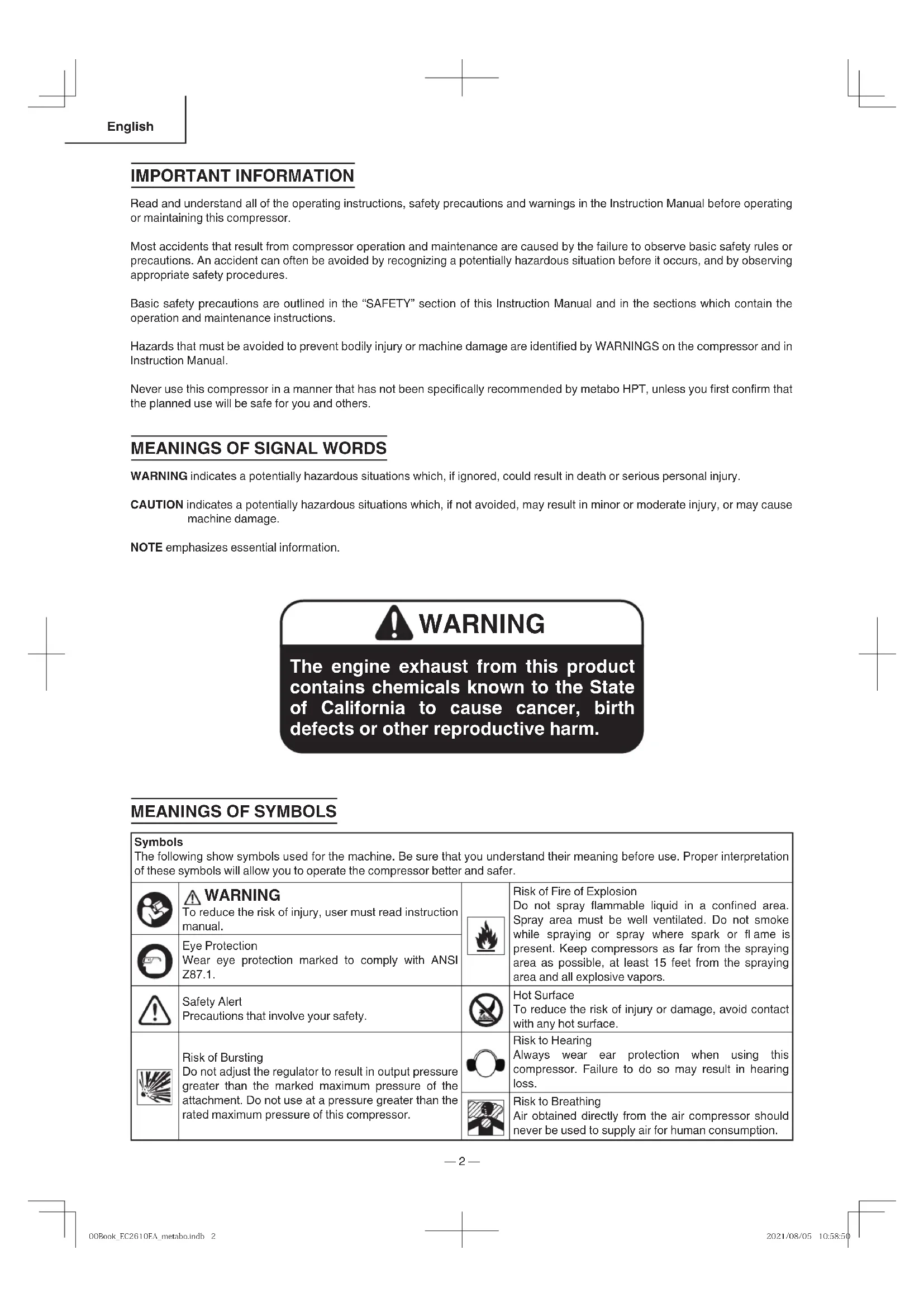 Symbols The following show symbols used for the machine. Be sure that you understand their meaning before use. Proper interpretation of these symbols will allow you to operate the compressor better and safer. WARNING To reduce the risk of injury, user must read instruction manual.Risk of Fire of Explosion Do not spray fl ammable liquid in a confi ned area. Spray area must be well ventilated. Do not smoke while spraying or spray where spark or fl ame is present. Keep compressors as far from the spraying area as possible, at least 15 feet from the spraying area and all explosive vapors.Eye ProtectionWear eye protection marked to comply with ANSI Z87.1.Safety AlertPrecautions that involve your safety.Hot SurfaceTo reduce the risk of injury or damage, avoid contact with any hot surface.Risk of BurstingDo not adjust the regulator to result in output pressure greater than the marked maximum pressure of the attachment. Do not use at a pressure greater than the rated maximum pressure of this compressor.Risk to HearingAlways wear ear protection when using this compressor. Failure to do so may result in hearing loss.Risk to BreathingAir obtained directly from the air compressor should never be used to supply air for human consumption. 00BookEC2610EAmetabo.indb200BookEC2610EAmetabo.indb2 2021/08/0510:58:502021/08/0510:58:50English — 3 — SAFETY IMPORTANT SAFETY INSTRUCTIONS FOR USE OF THE COMPRESSOR