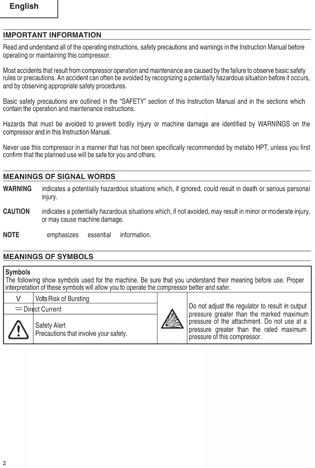 Volts Risk of Bursting Do not adjust the regulator to result in output pressure greater than the marked maximum pressure of the attachment. Do not use at a pressure greater than the rated maximum pressure of this compressor. --- Direct Current Safety Alert Precautions that involve your safety. 00BookEC36DANA.indb200BookEC36DANA.indb2 2021/07/089:36:152021/07/089:36:153 English