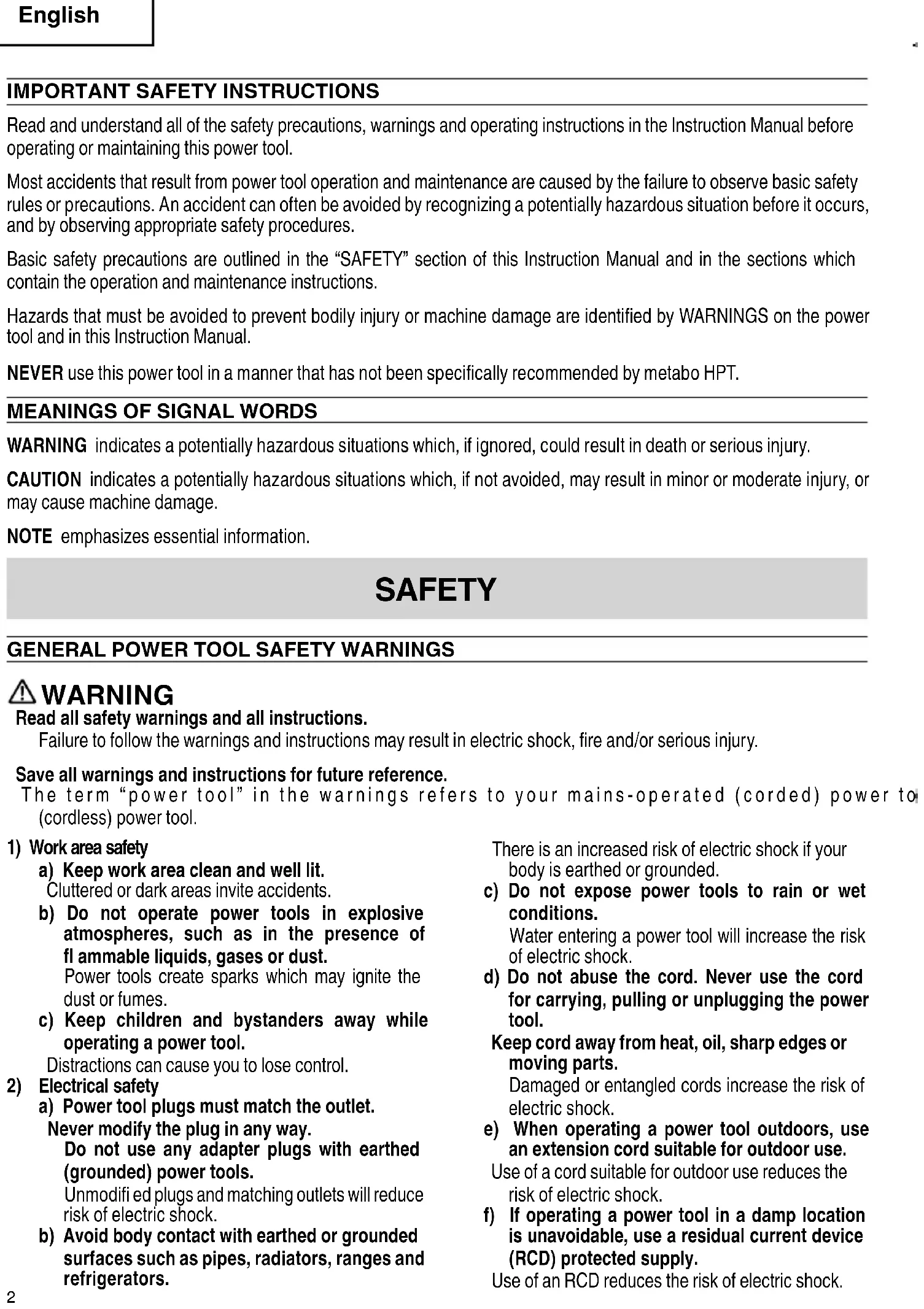 English 000BookG14DSLmetabo.indb9000BookG14DSLmetabo.indb9 2018/10/179:34:092018/10/179:34:09FUNCTIONAL DESCRIPTION NOTE The information contained in this Instruction Manual is designed to assist you in the safe operation and maintenance of the power tool. NEVER operate, or attempt any maintenance on the tool unless you have fi rst read and understood all safety instructions contained in this manual. Some illustrations in this Instruction Manual may show details or attachments that diff er from those on your own power tool.