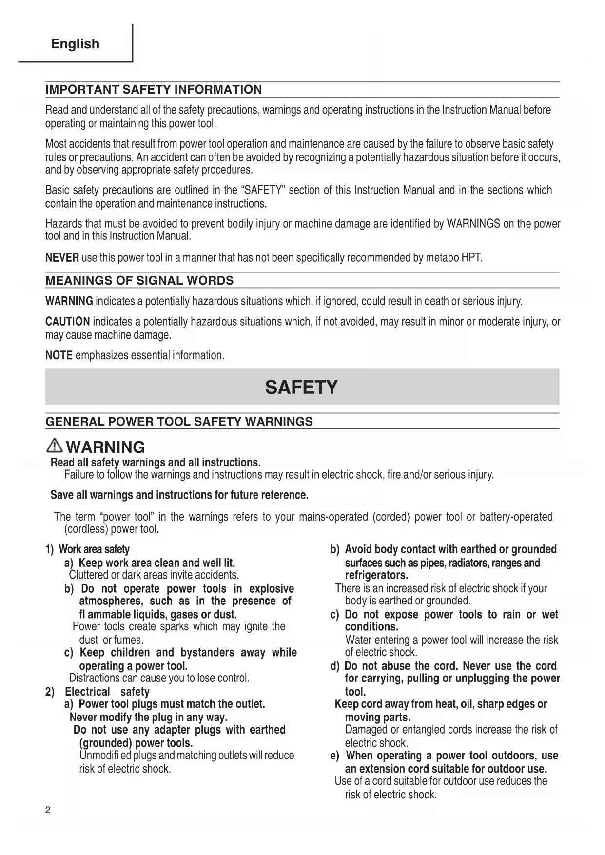 English 00BookG12VE2metaboNA.indb700BookG12VE2metaboNA.indb7 2022/05/318:39:132022/05/318:39:13FUNCTIONAL DESCRIPTION NOTE The information contained in this Instruction Manual is designed to assist you in the safe operation and maintenance of the power tool. NEVER operate, or attempt any maintenance on the tool unless you have fi rst read and understood all safey instructions contained in this manual. Some illustrations in this Instruction Manual may show details or attachments that diff er from those on your own power tool.