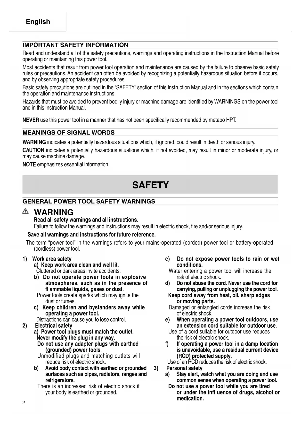 WARNING IMPROPER OR UNSAFE use of this power tool can result in death or serious bodily injury!This manual contains important information about product safety. Please read and understand this manual BEFORE operating the power tool. Please keep this manual available for other users and owners before they use the power tool. This manual should be stored in safe place. INSTRUCCIONES DE SEGURIDAD Y MANUAL DE INSTRUCCIONES ADVERTENCIA ¡La utilización INAPROPIADA O PELIGROSA de esta herramienta eléctrica puede resultar en lesiones de gravedad o la muerte!Este manual contiene información importante sobre la seguridad del producto. Lea y com-prenda este manual ANTES de utilizar la herramienta eléctrica. Guarde este manual para que puedan leerlo otras personas antes de utilizar la herramienta eléctrica. Este manual debe ser guardado en un lugar seguro. G12SE3 00BookG12SE3.indb100BookG12SE3.indb1 2020/02/1110:49:352020/02/1110:49:35IMPORTANT SAFETY INFORMATION Read and understand all of the safety precautions, warnings and operating instructions in the Instruction Manual before operating or maintaining this power tool. Most accidents that result from power tool operation and maintenance are caused by the failure to observe basic safety rules or precautions. An accident can often be avoided by recognizing a potentially hazardous situation before it occurs, and by observing appropriate safety procedures. Basic safety precautions are outlined in the “SAFETY” section of this Instruction Manual and in the sections which contain the operation and maintenance instructions. Hazards that must be avoided to prevent bodily injury or machine damage are identifi ed by WARNINGS on the power tool and in this Instruction Manual. NEVER use this power tool in a manner that has not been specifi cally recommended by metabo HPT.