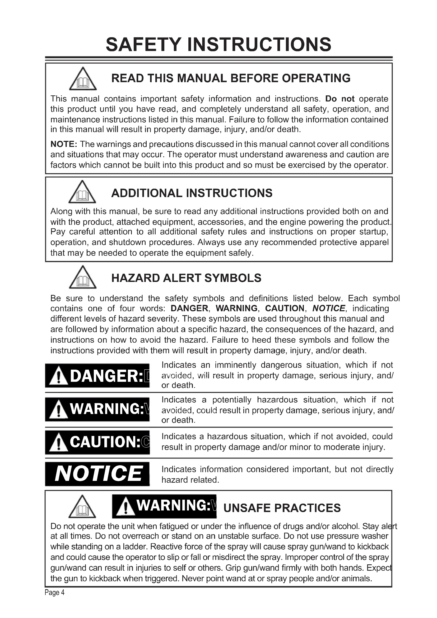 ADDITIONAL INSTRUCTIONSAlong with this manual, be sure to read any additional instructions provided both on and with the product, attached equipment, accessories, and the engine powering the product. Pay careful attention to all additional safety rules and instructions on proper startup, operation, and shutdown procedures. Always use any recommended protective apparel that may be needed to operate the equipment safely. Do not operate the unit when fatigued or under the inuence of drugs and/or alcohol. Stay alert at all times. Do not overreach or stand on an unstable surface. Do not use pressure washer while standing on a ladder. Reactive force of the spray will cause spray gun/wand to kickback and could cause the operator to slip or fall or misdirect the spray. Improper control of the spray gun/wand can result in injuries to self or others. Grip gun/wand rmly with both hands. Expect the gun to kickback when triggered. Never point wand at or spray people and/or animals.