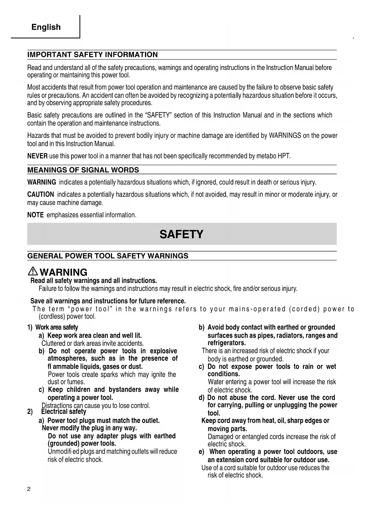 All quality power tools will eventually require servicing or replacement of parts because of wear from normal use. To assure that only authorized replacement parts will be used, all service and repairs must be performed by a metabo HPT AUTHORIZED SERVICE CENTER, ONLY. CAUTION In the operation and maintenance of power tools, the safety regulations and standards prescribed in each country must be observed. Important notice on the batteries for the metabo HPT cordless power tools Please always use one of our designated genuine batteries. We cannot guarantee the safety and performance of our cordless power tool when used with batteries other than these designated by us, or when the battery is disassembled and modifi ed (such as disassembly and replacement of cells or other internal parts).