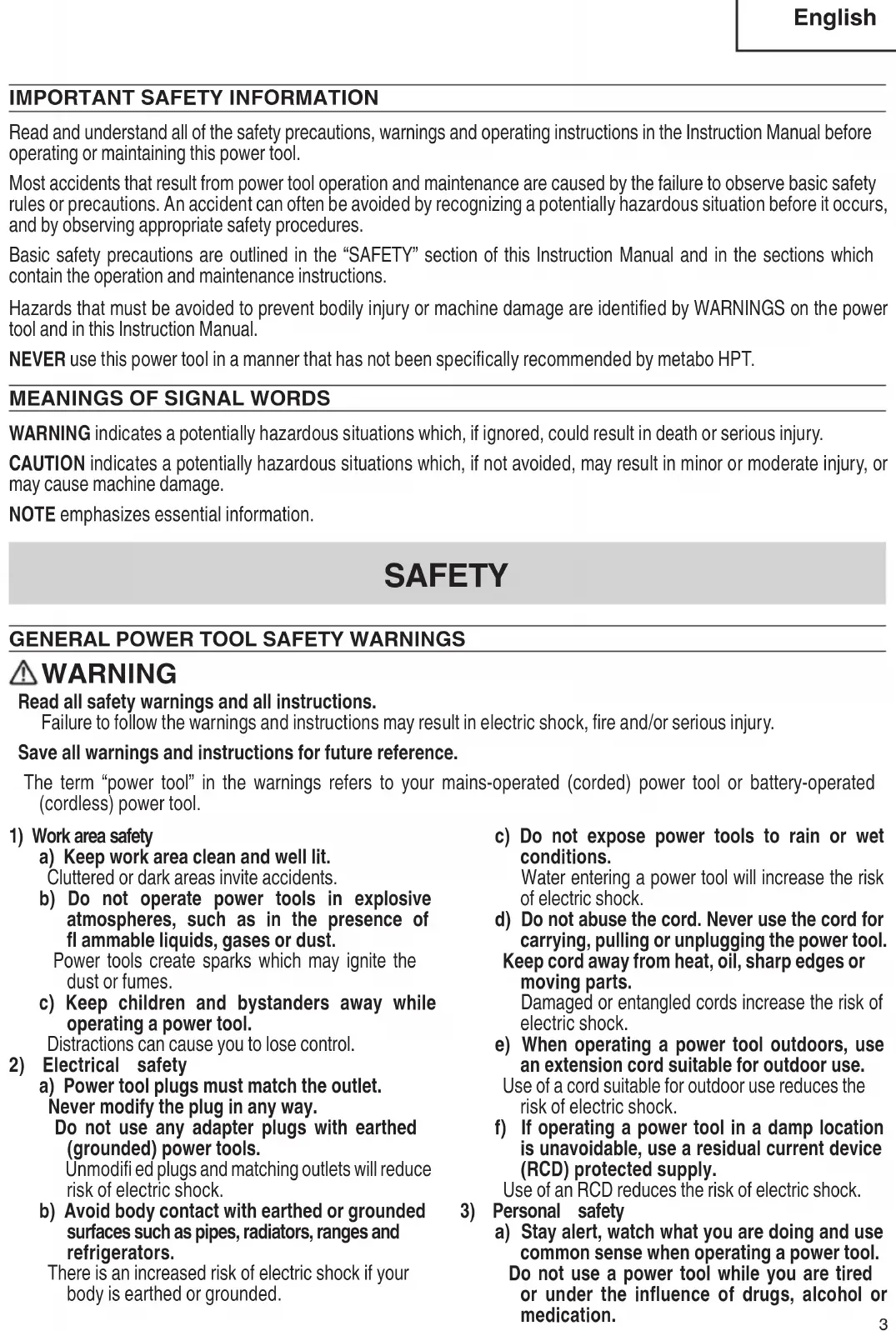 Read and understand all of the safety precautions, warnings and operating instructions in the Instruction Manual before operating or maintaining this power tool. Most accidents that result from power tool operation and maintenance are caused by the failure to observe basic safety rules or precautions. An accident can often be avoided by recognizing a potentially hazardous situation before it occurs, and by observing appropriate safety procedures. Basic safety precautions are outlined in the “SAFETY” section of this Instruction Manual and in the sections which contain the operation and maintenance instructions. Hazards that must be avoided to prevent bodily injury or machine damage are identifi ed by WARNINGS on the power tool and in this Instruction Manual. NEVER use this power tool in a manner that has not been specifi cally recommended by metabo HPT.
