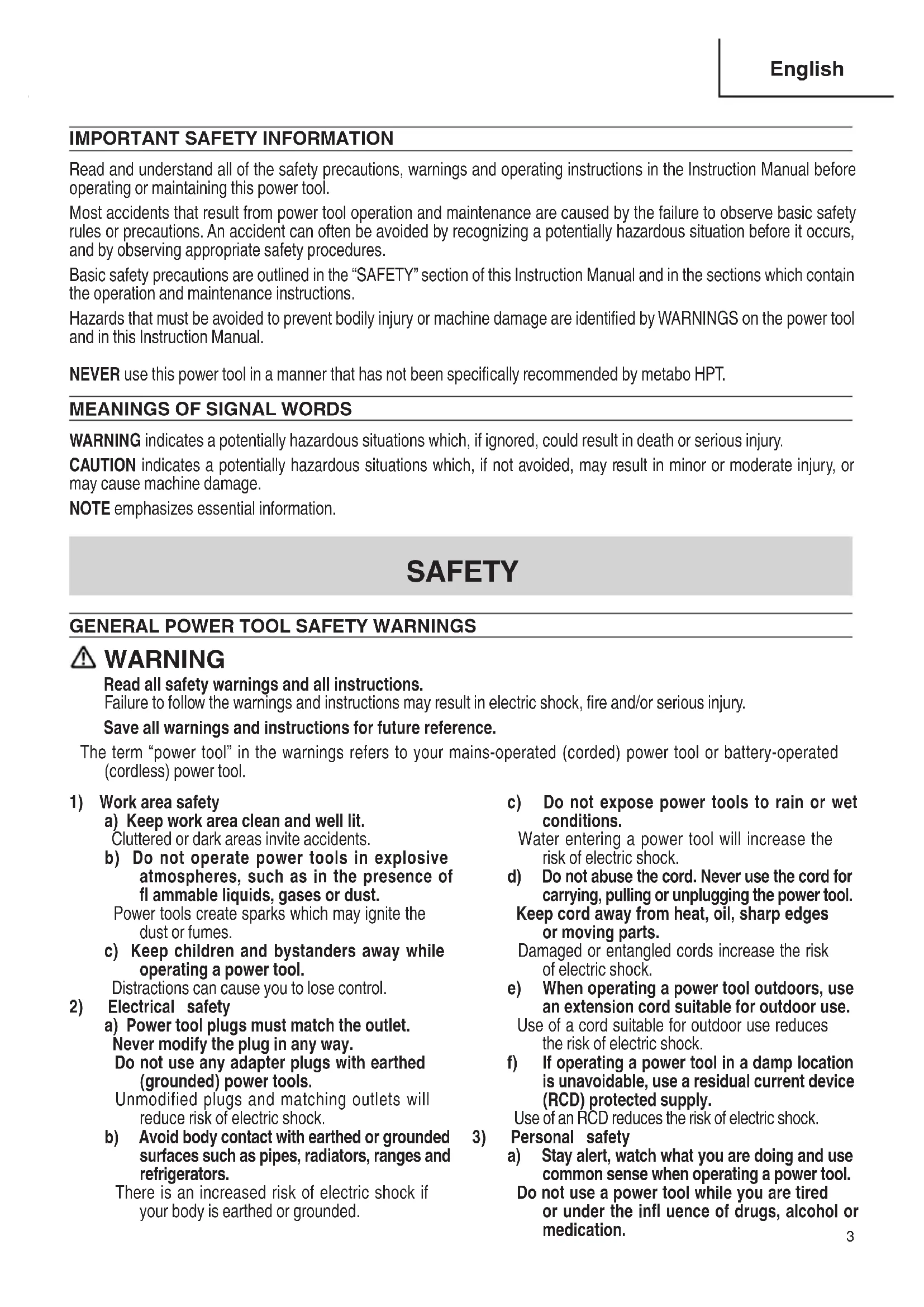 Read and understand all of the safety precautions, warnings and operating instructions in the Instruction Manual before operating or maintaining this power tool. Most accidents that result from power tool operation and maintenance are caused by the failure to observe basic safety rules or precautions. An accident can often be avoided by recognizing a potentially hazardous situation before it occurs, and by observing appropriate safety procedures. Basic safety precautions are outlined in the “SAFETY” section of this Instruction Manual and in the sections which contain the operation and maintenance instructions. Hazards that must be avoided to prevent bodily injury or machine damage are identifi ed by WARNINGS on the power tool and in this Instruction Manual. NEVER use this power tool in a manner that has not been specifi cally recommended by metabo HPT.