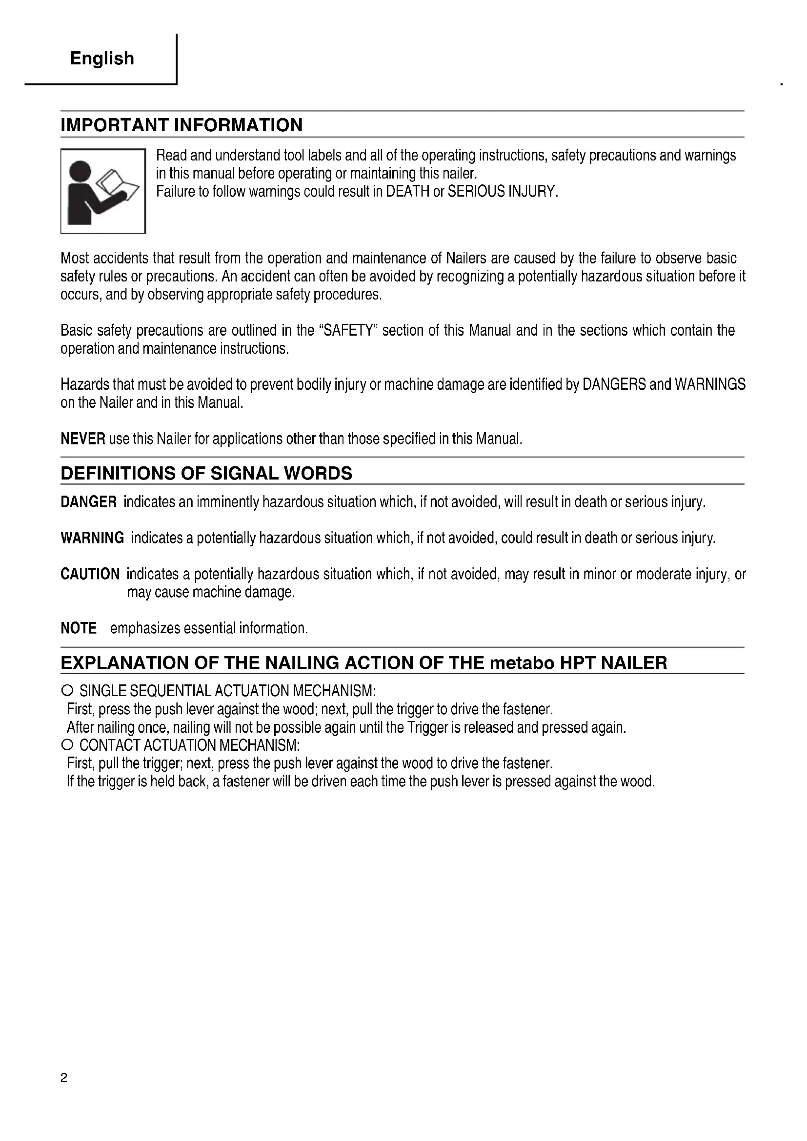 DANGER indicates an imminently hazardous situation which, if not avoided, will result in death or serious injury. WARNING indicates a potentially hazardous situation which, if not avoided, could result in death or serious injury. CAUTION indicates a potentially hazardous situation which, if not avoided, may result in minor or moderate injury, or may cause machine damage. NOTE emphasizes essential information. EXPLANATION OF THE NAILING ACTION OF THE metabo HPT NAILER