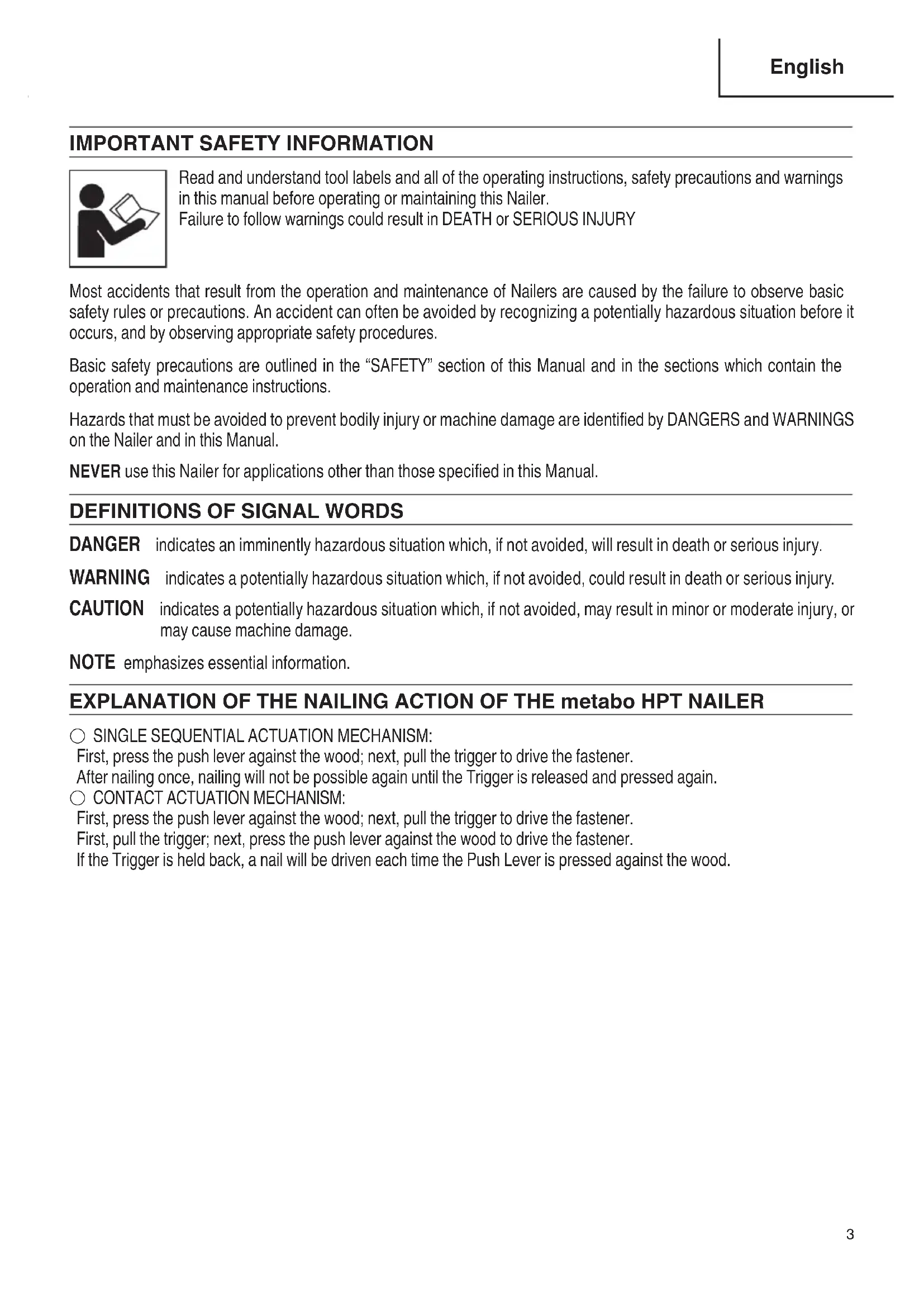 DANGER indicates an imminently hazardous situation which, if not avoided, will result in death or serious injury. WARNING indicates a potentially hazardous situation which, if not avoided, could result in death or serious injury. CAUTION indicates a potentially hazardous situation which, if not avoided, may result in minor or moderate injury, or may cause machine damage. NOTE emphasizes essential information. EXPLANATION OF THE NAILING ACTION OF THE metabo HPT NAILER