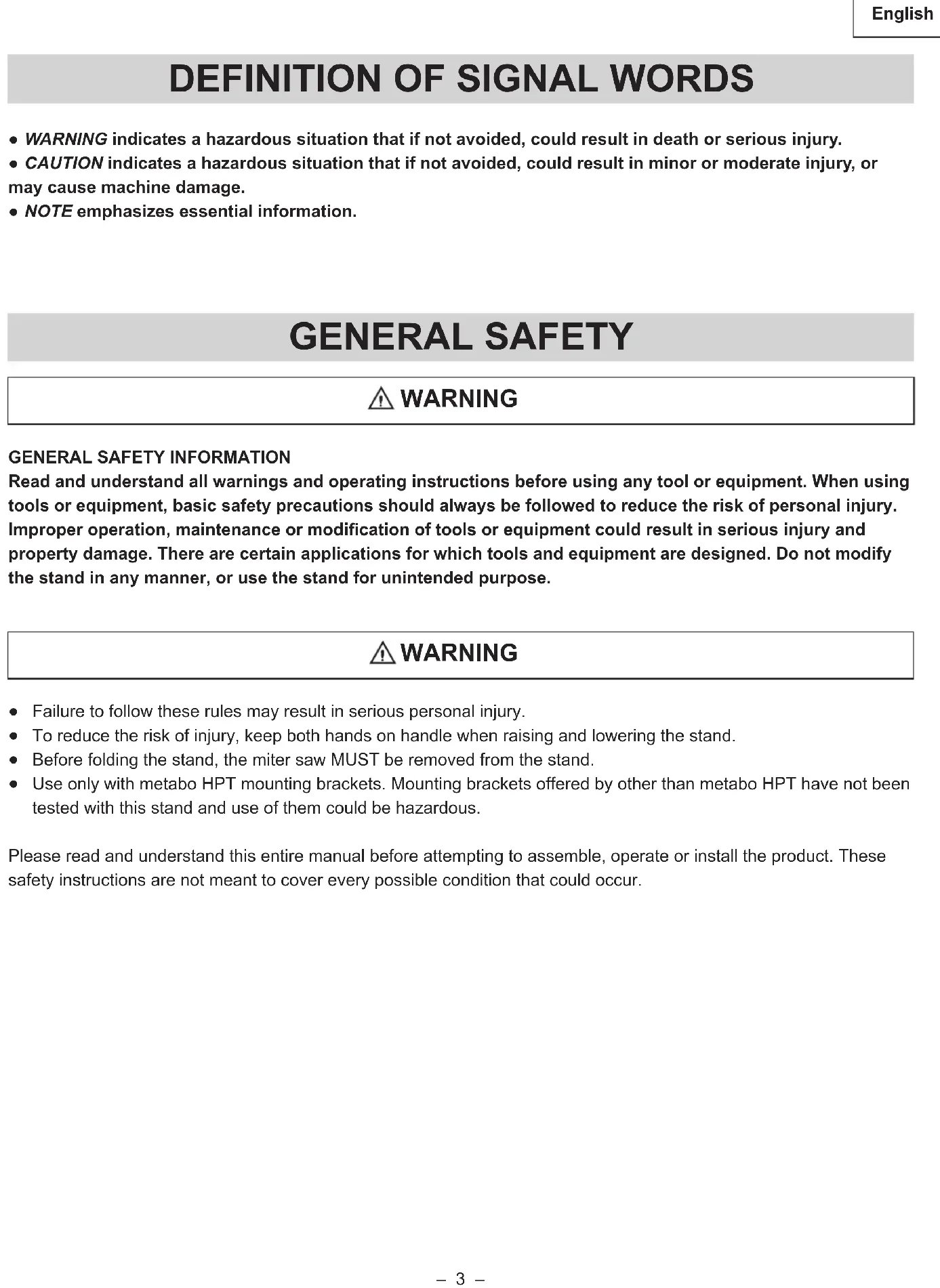 Use only with metabo HPT mounting brackets. Mounting brackets offered by other than metabo HPT have not been tested with this stand and use of them could be hazardous. Please read and understand this entire manual before attempting to assemble, operate or install the product. These safety instructions are not meant to cover every possible condition that could occur.– 4 – English