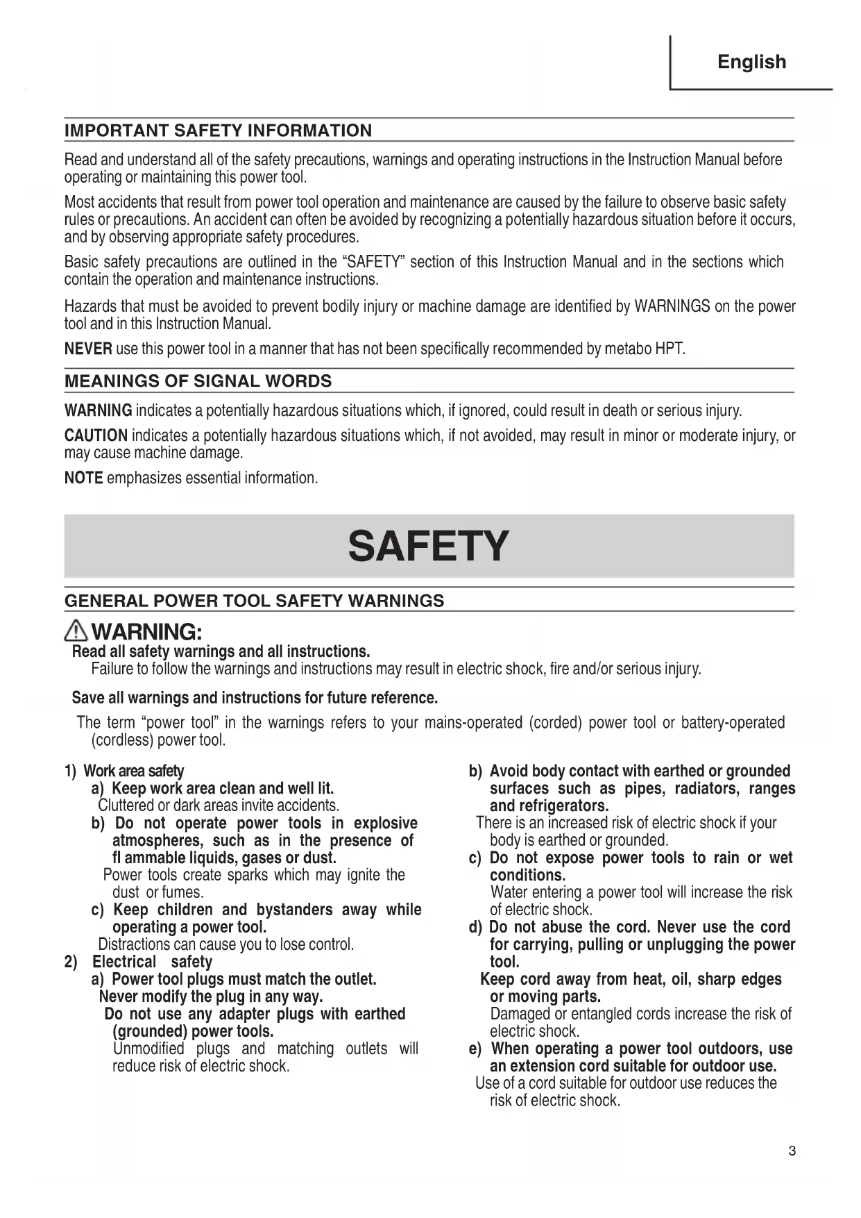Read and understand all of the safety precautions, warnings and operating instructions in the Instruction Manual before operating or maintaining this power tool. Most accidents that result from power tool operation and maintenance are caused by the failure to observe basic safety rules or precautions. An accident can often be avoided by recognizing a potentially hazardous situation before it occurs, and by observing appropriate safety procedures. Basic safety precautions are outlined in the “SAFETY” section of this Instruction Manual and in the sections which contain the operation and maintenance instructions. Hazards that must be avoided to prevent bodily injury or machine damage are identifi ed by WARNINGS on the power tool and in this Instruction Manual. NEVER use this power tool in a manner that has not been specifi cally recommended by metabo HPT.