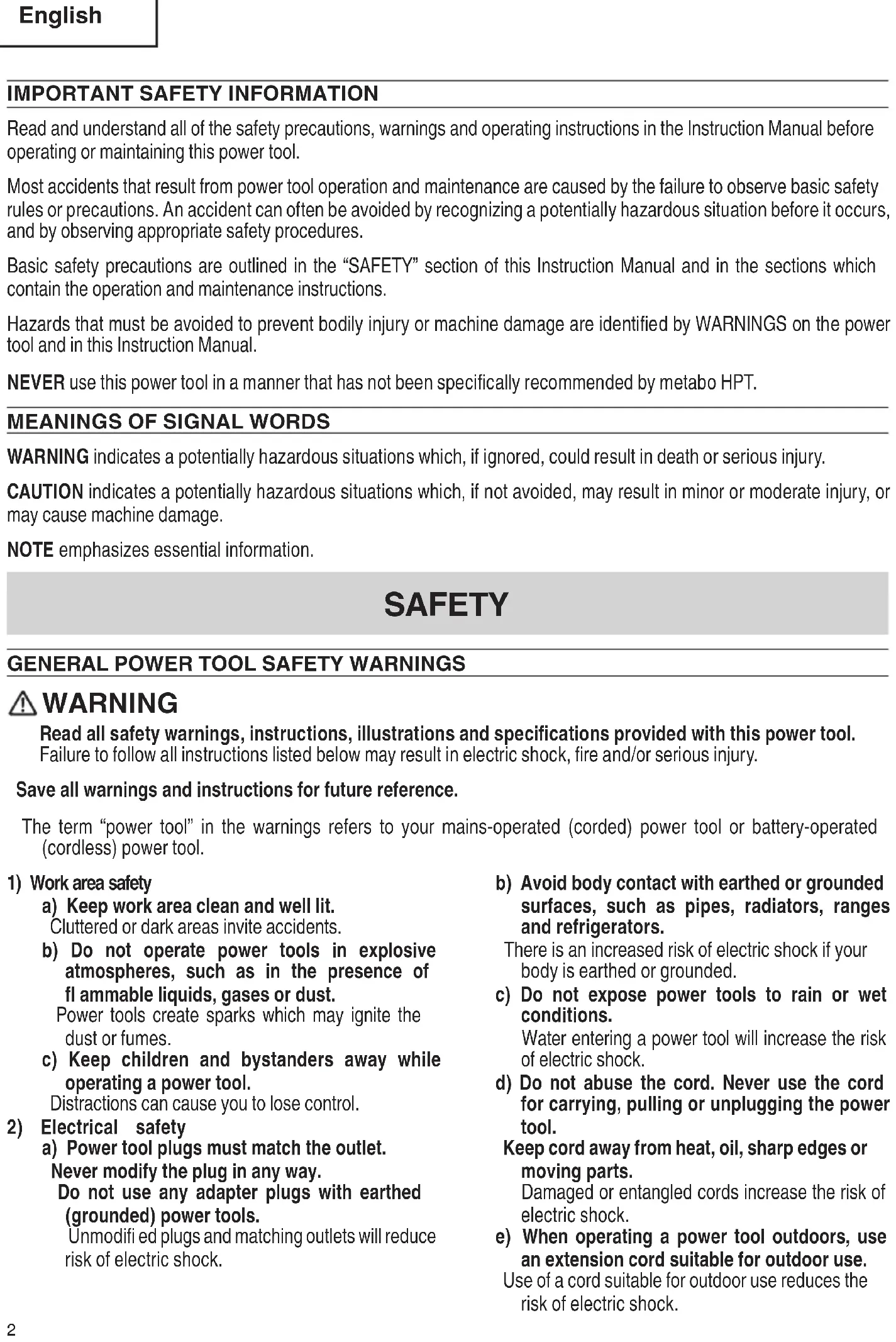 All quality power tools will eventually require servicing or replacement of parts because of wear from normal use. To assure that only authorized replacement parts will be used, all service and repairs must be performed by a metabo HPT AUTHORIZED SERVICE CENTER, ONLY. CAUTION In the operation and maintenance of power tools, the safety regulations and standards prescribed in each country must be observed. Important notice on the batteries for the metabo HPT cordless power tools Please always use one of our designated genuine batteries. We cannot guarantee the safety and performance of our cordless power tool when used with batteries other than these designated by us, or when the battery is disassembled and modifi ed (such as disassembly and replacement of cells or other internal parts).