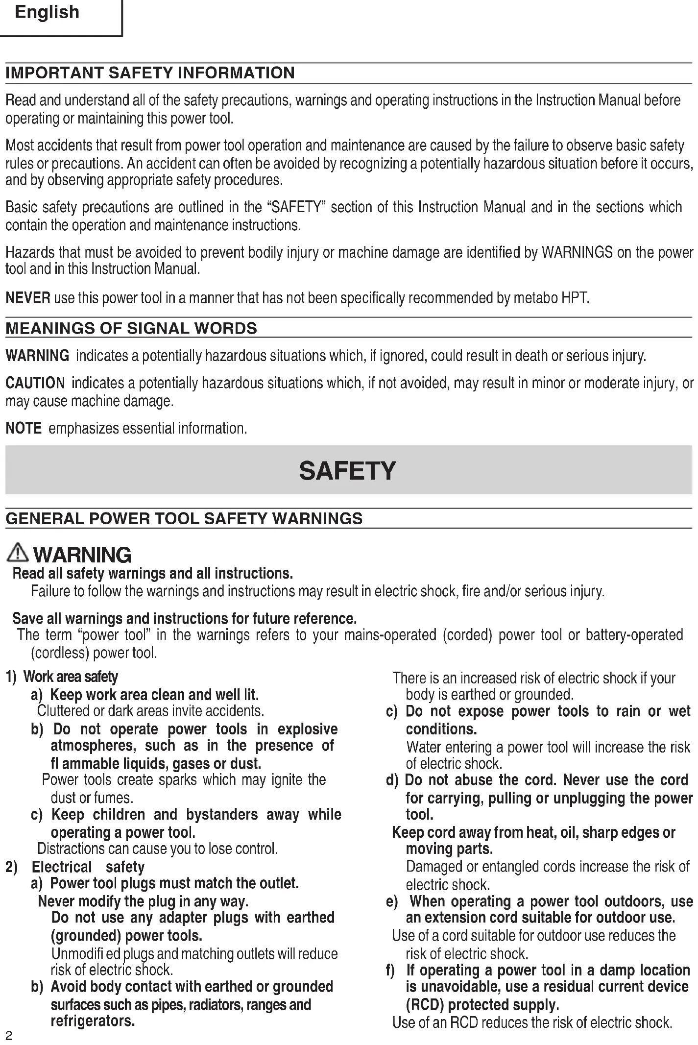 All quality power tools will eventually require servicing or replacement of parts because of wear from normal use. To assure that only authorized replacement parts will be used, all service and repairs must be performed by a metabo HPT AUTHORIZED SERVICE CENTER, ONLY. CAUTION In the operation and maintenance of power tools, the safety regulations and standards prescribed in each country must be observed. MODIFICATIONS: metabo HPT Power Tools are constantly being improved and modifi ed to incorporate the latest technological advancements. Accordingly, some parts may be changed without prior notice. Important notice on the batteries for the metabo HPT cordless power tools Please always use one of our designated genuine batteries. We cannot guarantee the safety and performance of our cordless power tool when used with batteries other than these designated by us, or when the battery is disassembled and modifi ed (such as disassembly and replacement of cells or other internal parts).