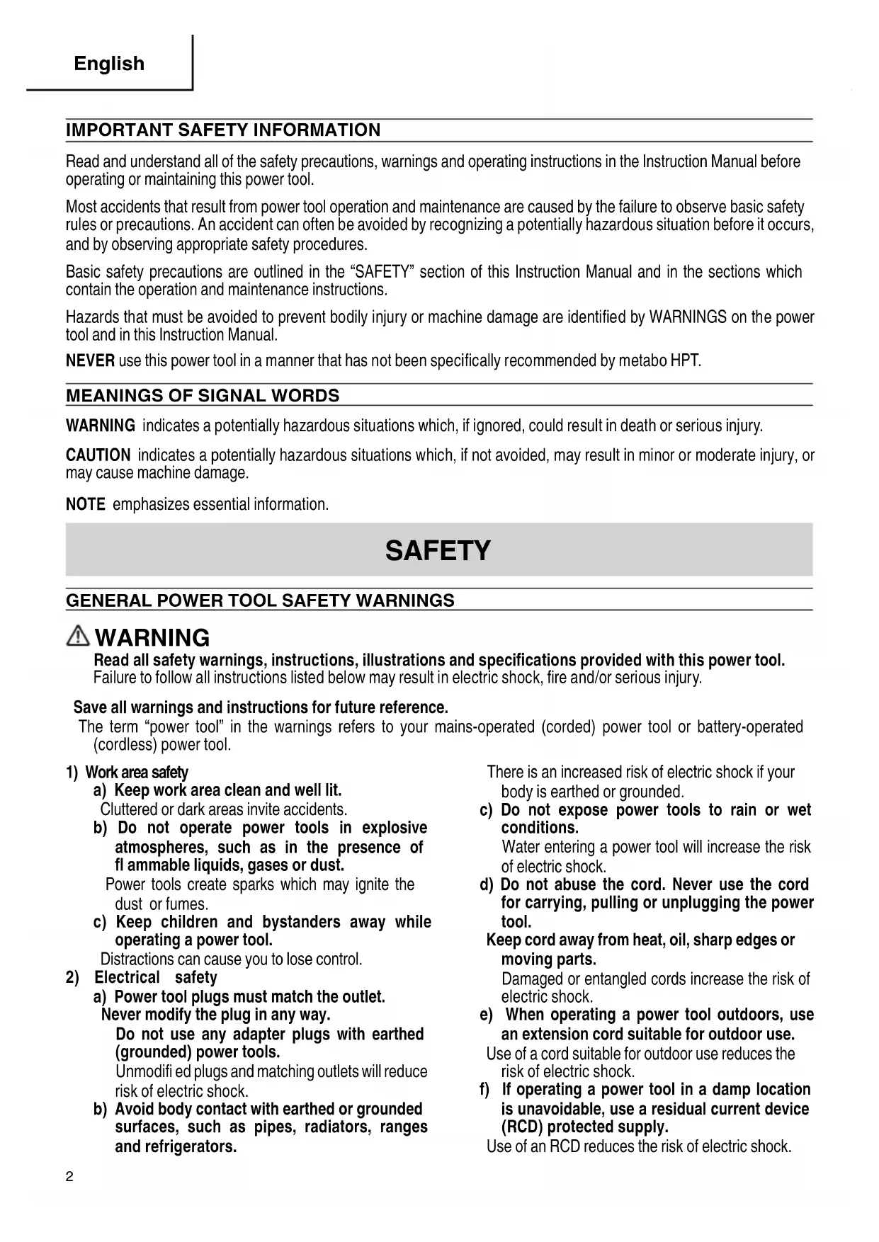 000BookDS18DEXmetabo.indb1000BookDS18DEXmetabo.indb1 2022/07/1113:46:002022/07/1113:46:00IMPORTANT SAFETY INFORMATION Read and understand all of the safety precautions, warnings and operating instructions in the Instruction Manual before operating or maintaining this power tool. Most accidents that result from power tool operation and maintenance are caused by the failure to observe basic safety rules or precautions. An accident can often be avoided by recognizing a potentially hazardous situation before it occurs, and by observing appropriate safety procedures. Basic safety precautions are outlined in the “SAFETY” section of this Instruction Manual and in the sections which contain the operation and maintenance instructions. Hazards that must be avoided to prevent bodily injury or machine damage are identifi ed by WARNINGS on the power tool and in this Instruction Manual. NEVER use this power tool in a manner that has not been specifi cally recommended by metabo HPT.