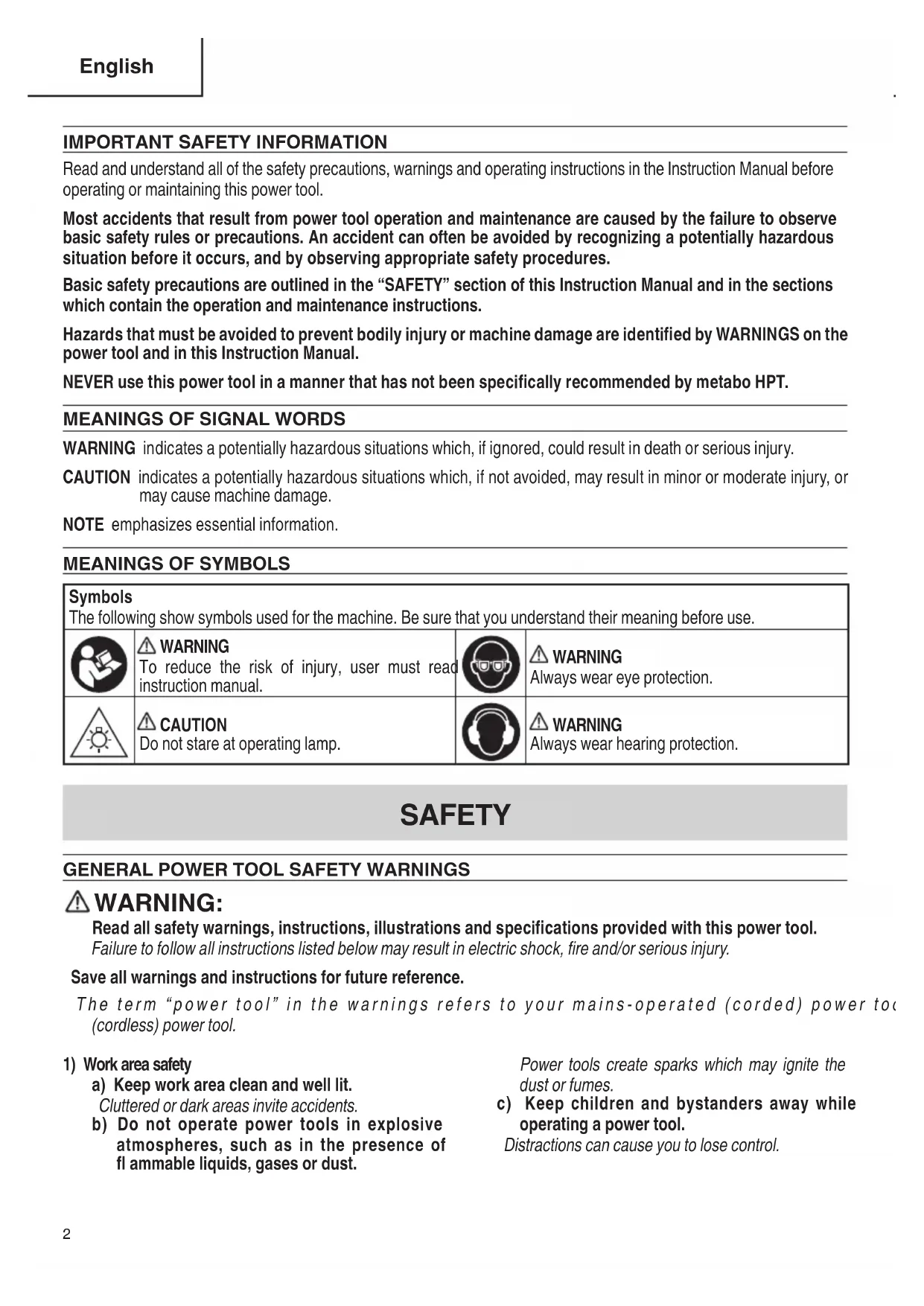 Read and understand all of the safety precautions, warnings and operating instructions in the Instruction Manual before operating or maintaining this power tool. Most accidents that result from power tool operation and maintenance are caused by the failure to observe basic safety rules or precautions. An accident can often be avoided by recognizing a potentially hazardous situation before it occurs, and by observing appropriate safety procedures. Basic safety precautions are outlined in the “SAFETY” section of this Instruction Manual and in the sections which contain the operation and maintenance instructions. Hazards that must be avoided to prevent bodily injury or machine damage are identifi ed by WARNINGS on the power tool and in this Instruction Manual. NEVER use this power tool in a manner that has not been specifi cally recommended by metabo HPT.