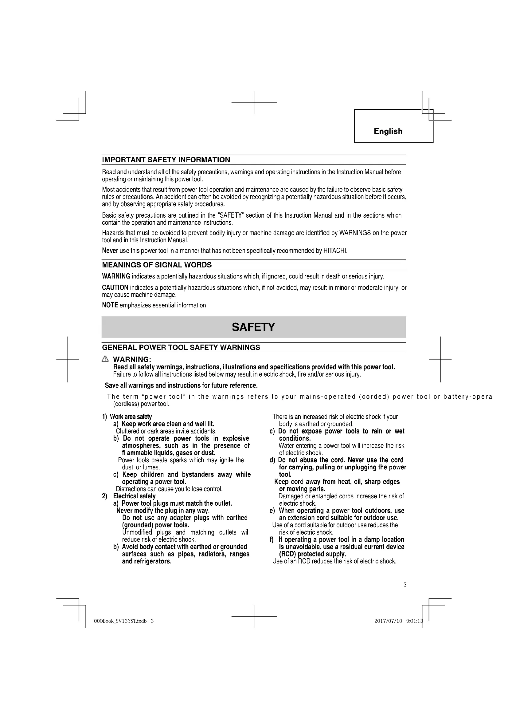 a) Power tool plugs must match the outlet. Never modify the plug in any way. Do not use any adapter plugs with earthed (grounded) power tools. Unmodifi ed plugs and matching outlets will reduce risk of electric shock. b) Avoid body contact with earthed or grounded surfaces such as pipes, radiators, ranges and refrigerators. There is an increased risk of electric shock if your body is earthed or grounded. c) Do not expose power tools to rain or wet conditions. Water entering a power tool will increase the risk of electric shock. d) Do not abuse the cord. Never use the cord for carrying, pulling or unplugging the power tool. Keep cord away from heat, oil, sharp edges or moving parts. Damaged or entangled cords increase the risk of electric shock. e) When operating a power tool outdoors, use an extension cord suitable for outdoor use. Use of a cord suitable for outdoor use reduces the risk of electric shock. f) If operating a power tool in a damp location is unavoidable, use a residual current device (RCD) protected supply. Use of an RCD reduces the risk of electric shock. 000BookSV13YST.indb3000BookSV13YST.indb3 2017/07/109:01:132017/07/109:01:134 English