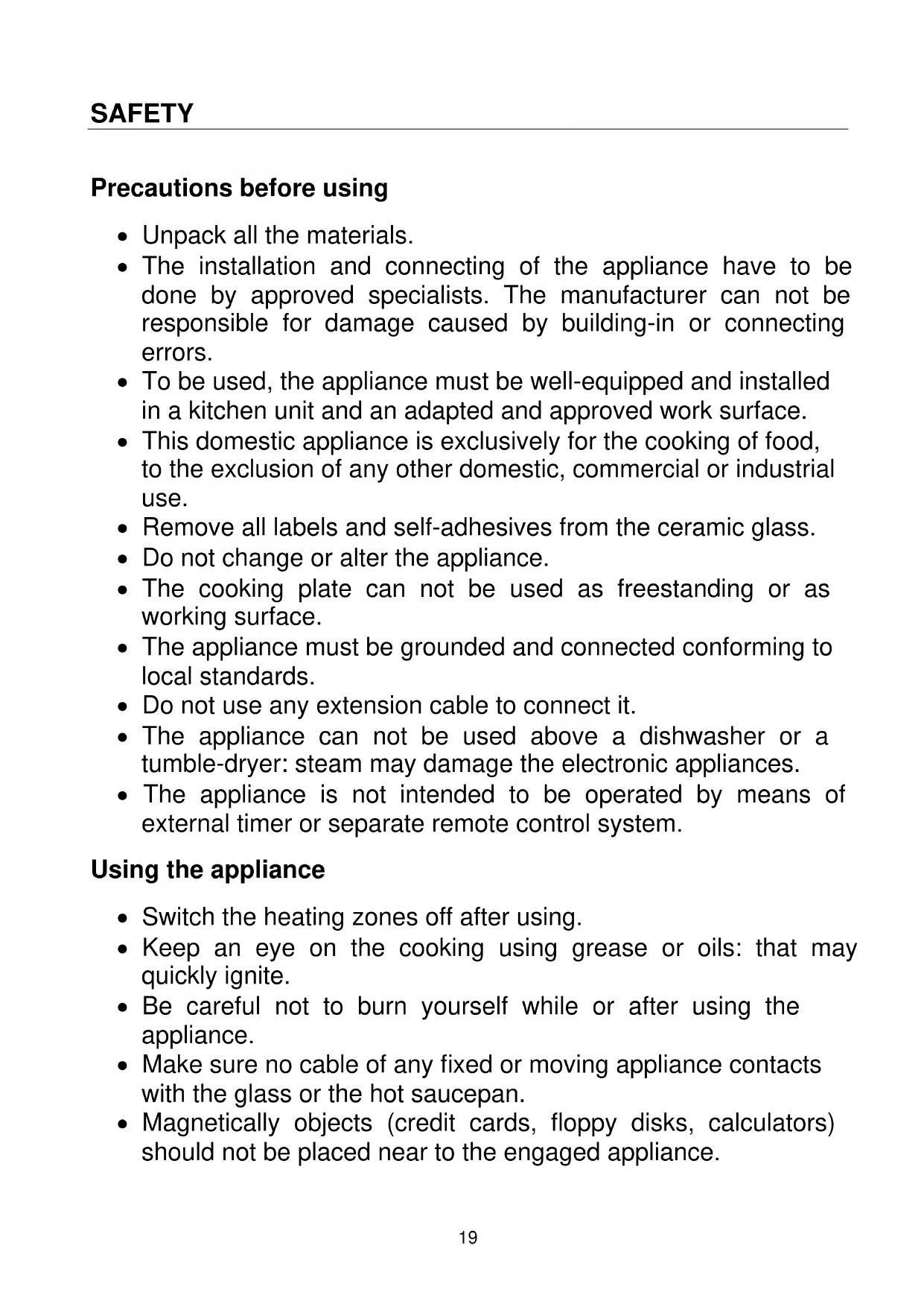 - Sugar, synthetic materials or aluminium sheets must not contact with the heating zones. These may cause breaks or other alterations of the vitroceramic glass by cooling: switch on the appliance and take them immediately out of the hot heating zone (be careful: do not burn yourself).