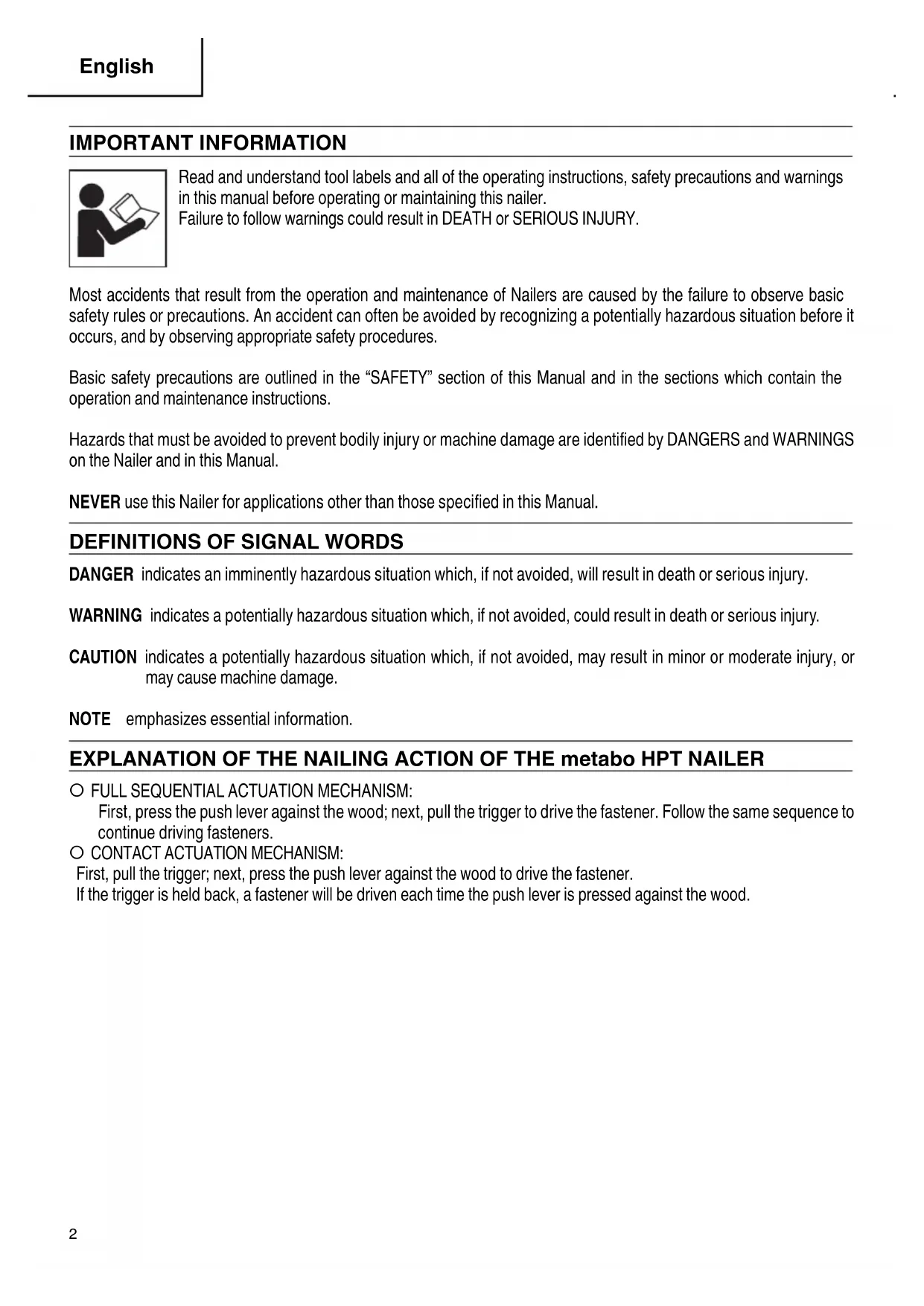 DANGER indicates an imminently hazardous situation which, if not avoided, will result in death or serious injury. WARNING indicates a potentially hazardous situation which, if not avoided, could result in death or serious injury. CAUTION indicates a potentially hazardous situation which, if not avoided, may result in minor or moderate injury, or may cause machine damage. NOTE emphasizes essential information. EXPLANATION OF THE NAILING ACTION OF THE metabo HPT NAILER