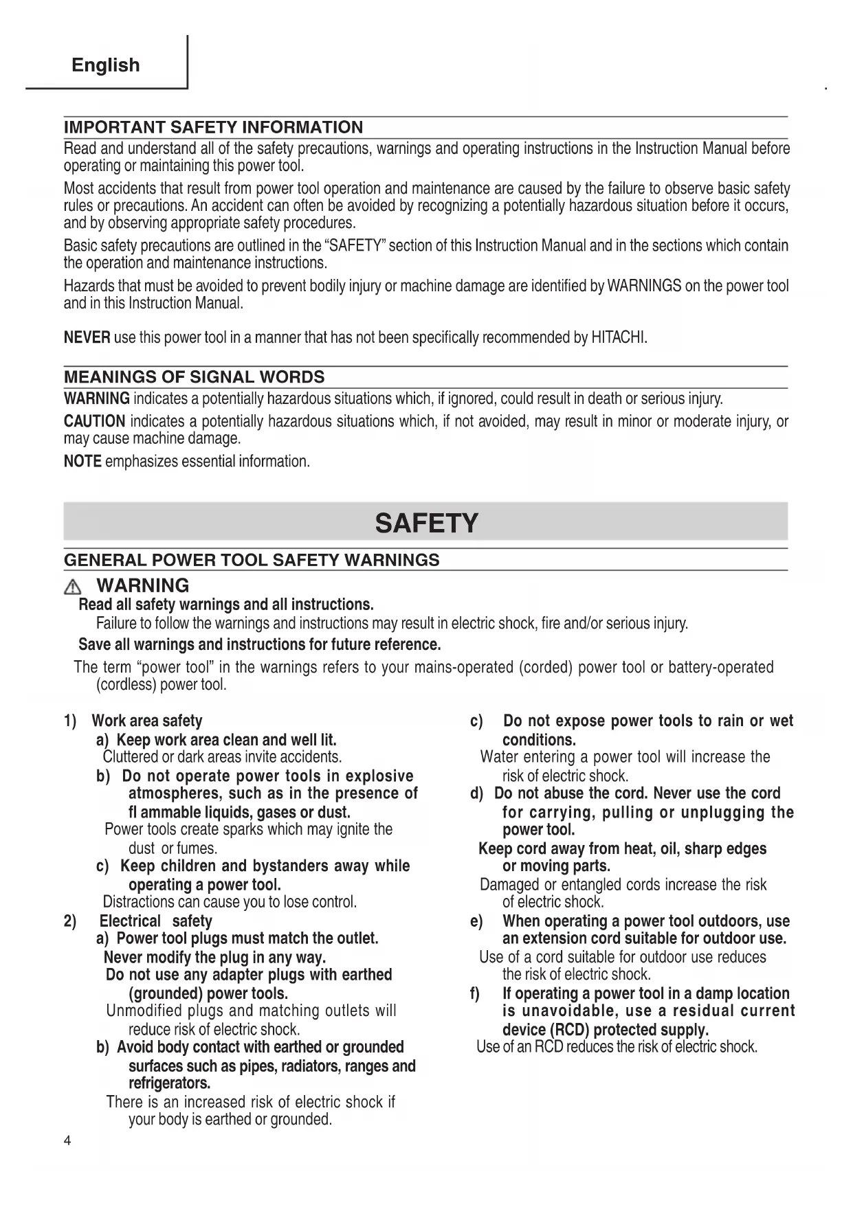 Read and understand all of the safety precautions, warnings and operating instructions in the Instruction Manual before operating or maintaining this power tool. Most accidents that result from power tool operation and maintenance are caused by the failure to observe basic safety rules or precautions. An accident can often be avoided by recognizing a potentially hazardous situation before it occurs, and by observing appropriate safety procedures. Basic safety precautions are outlined in the “SAFETY” section of this Instruction Manual and in the sections which contain the operation and maintenance instructions. Hazards that must be avoided to prevent bodily injury or machine damage are identifi ed by WARNINGS on the power tool and in this Instruction Manual. NEVER use this power tool in a manner that has not been specifi cally recommended by HITACHI.