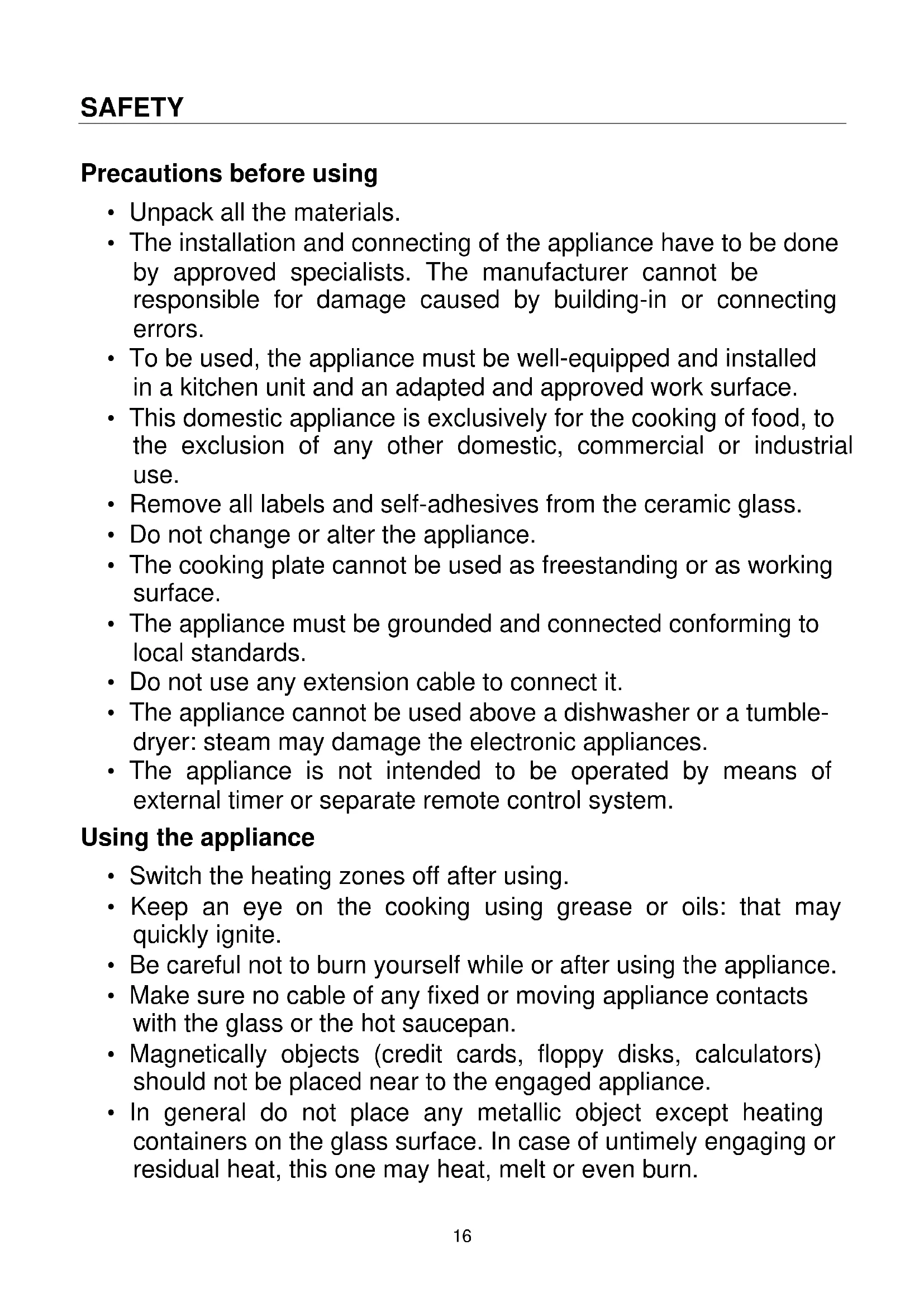- Sugar, synthetic materials or aluminium sheets must not contact with the heating zones. These may cause breaks or other alterations of the vitroceramic glass by cooling: switch on the appliance and take them immediately out of the hot heating zone (be careful: do not burn yourself).