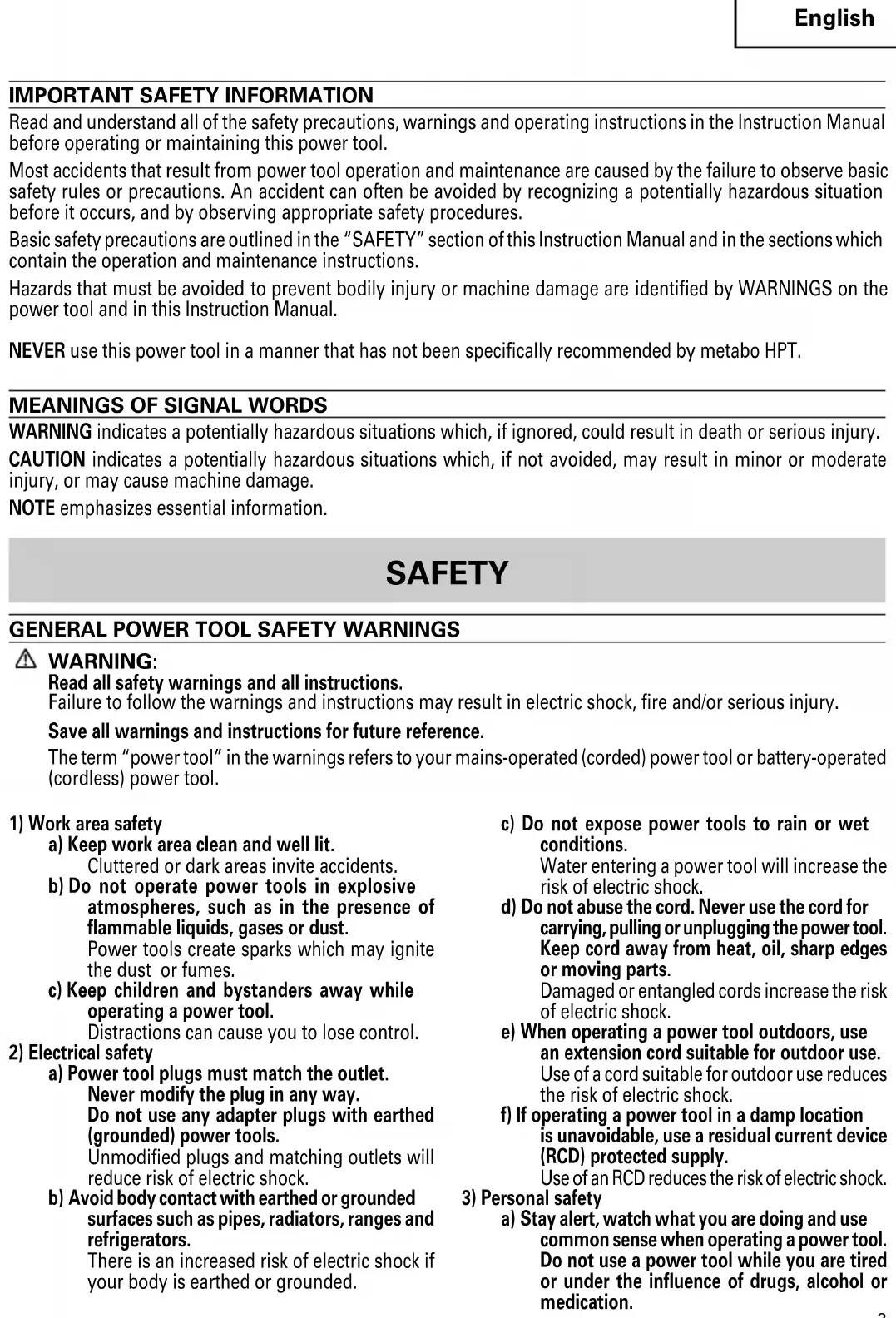 Read and understand all of the safety precautions, warnings and operating instructions in the Instruction Manual before operating or maintaining this power tool. Most accidents that result from power tool operation and maintenance are caused by the failure to observe basic safety rules or precautions. An accident can often be avoided by recognizing a potentially hazardous situation before it occurs, and by observing appropriate safety procedures. Basic safety precautions are outlined in the “SAFETY” section of this Instruction Manual and in the sections which contain the operation and maintenance instructions. Hazards that must be avoided to prevent bodily injury or machine damage are identified by WARNINGS on the power tool and in this Instruction Manual. NEVER use this power tool in a manner that has not been specifically recommended by metabo HPT.