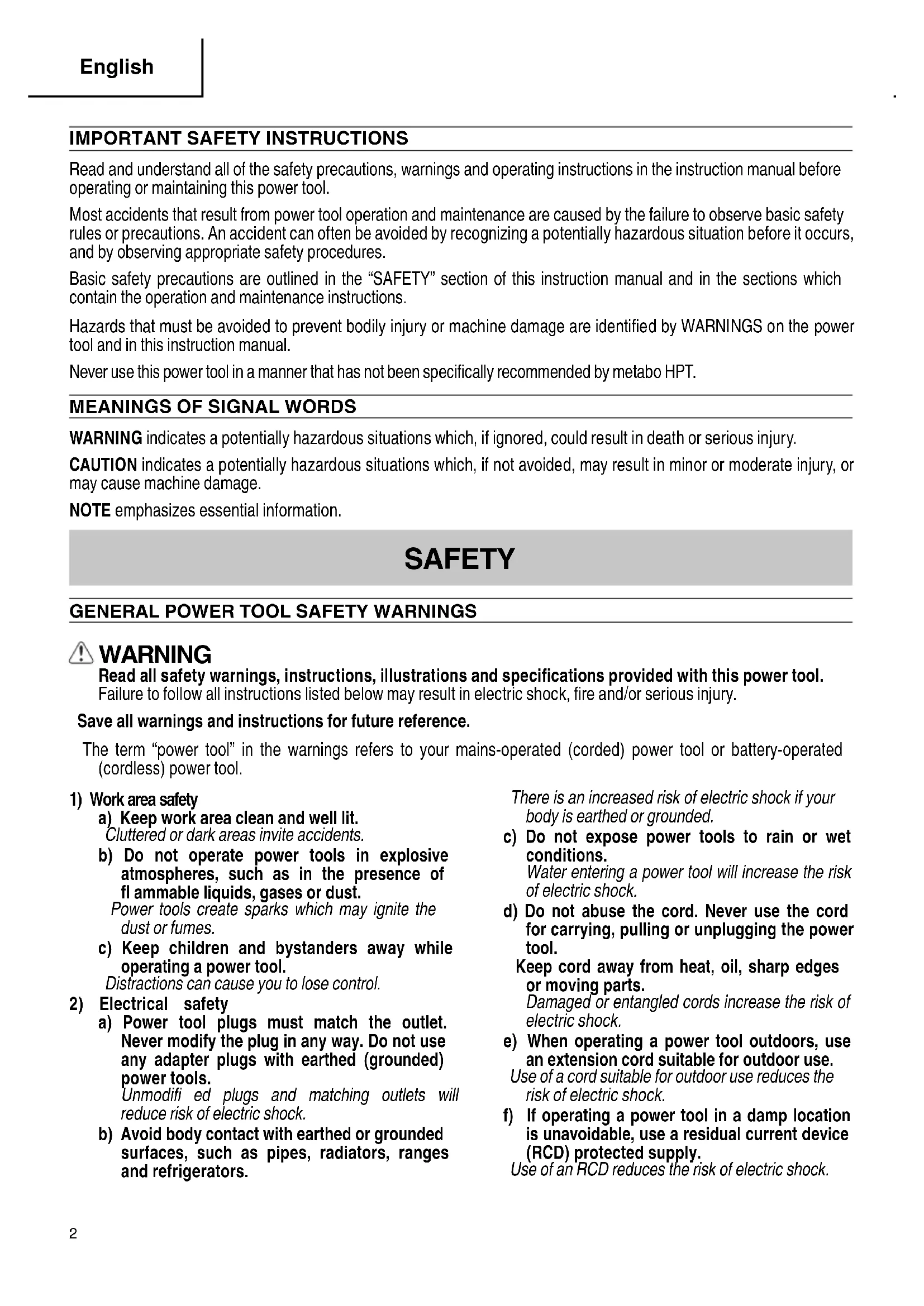 Read and understand all of the safety precautions, warnings and operating instructions in the instruction manual before operating or maintaining this power tool. Most accidents that result from power tool operation and maintenance are caused by the failure to observe basic safety rules or precautions. An accident can often be avoided by recognizing a potentially hazardous situation before it occurs, and by observing appropriate safety procedures. Basic safety precautions are outlined in the “SAFETY” section of this instruction manual and in the sections which contain the operation and maintenance instructions. Hazards that must be avoided to prevent bodily injury or machine damage are identifi ed by WARNINGS on the power tool and in this instruction manual. Never use this power tool in a manner that has not been specifi cally recommended by metabo HPT.