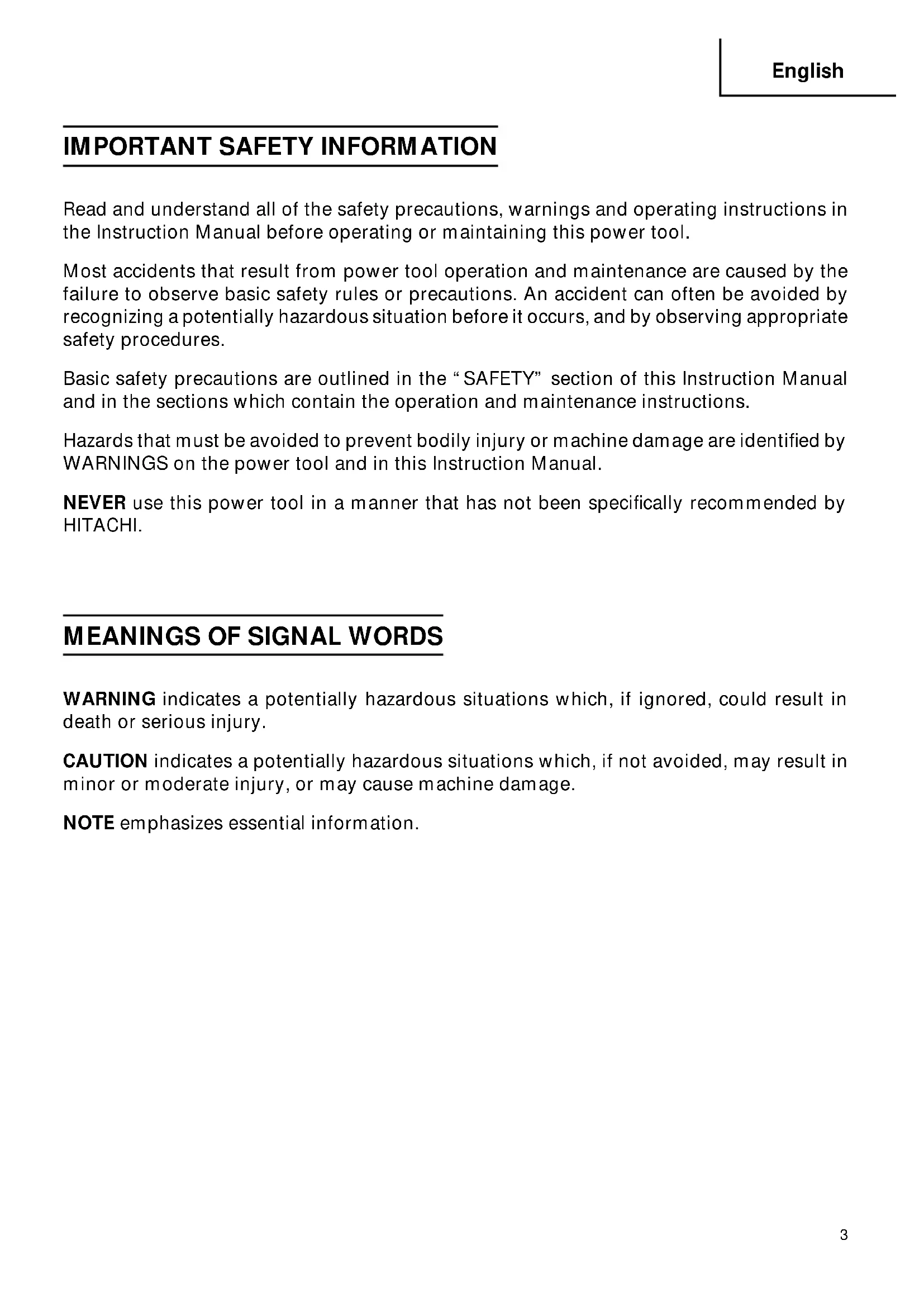 Read and understand all of the safety precautions, warnings and operating instructions in the Instruction Manual before operating or maintaining this power tool. Most accidents that result from power tool operation and maintenance are caused by the failure to observe basic safety rules or precautions. An accident can often be avoided by recognizing a potentially hazardous situation before it occurs, and by observing appropriate safety procedures. Basic safety precautions are outlined in the “SAFETY” section of this Instruction Manual and in the sections which contain the operation and maintenance instructions. Hazards that must be avoided to prevent bodily injury or machine damage are identified by WARNINGS on the power tool and in this Instruction Manual. NEVER use this power tool in a manner that has not been specifically recommended by HITACHI.