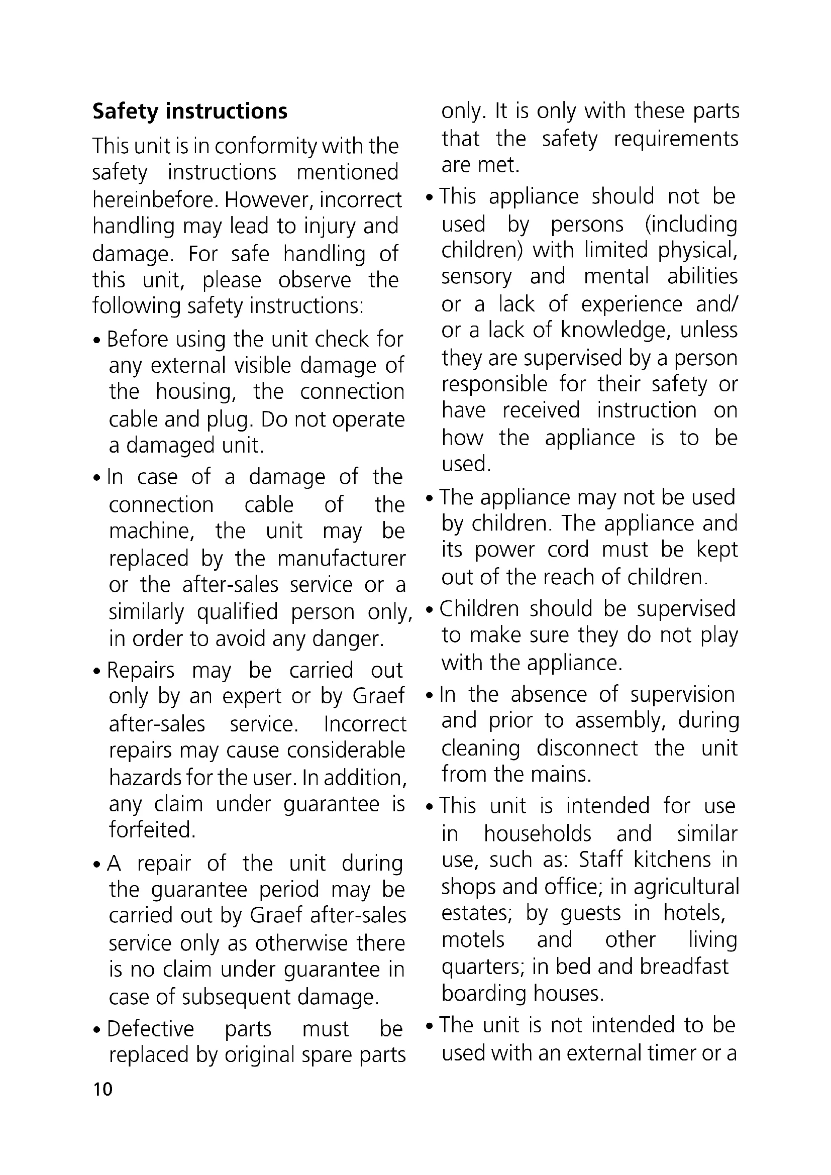 - Repairs may be carried out only by an expert or by Graef after-sales service. Incorrect repairs may cause considerable hazards for the user. In addition, any claim under guarantee is forfeited.