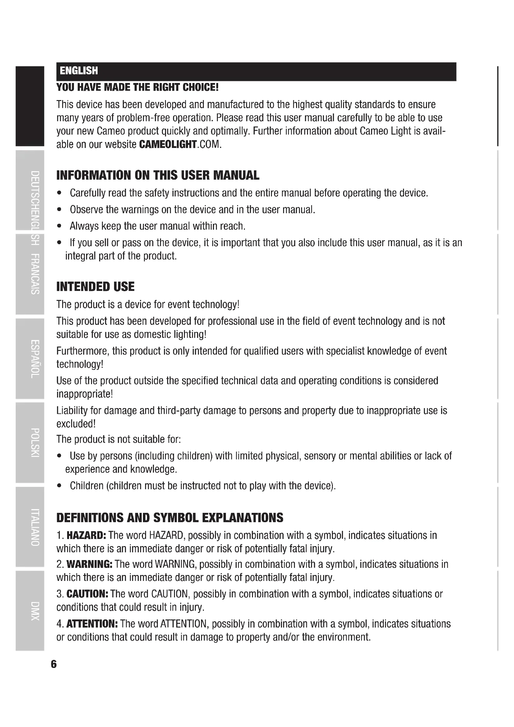 DMX DMX CONTROL / DMX STEUERUNG / PILOTAGE DMX / CONTROL DMX / STEROWANIE DMX / CON- TROLLO DMX 1596 DMX ITALIANO POLSKI ESPAÑOL FRANCAIS DEUTSCHENGLISH ENGLISH YOU HAVE MADE THE RIGHT CHOICE! This device has been developed and manufactured to the highest quality standards to ensure many years of problem-free operation. Please read this user manual carefully to be able to use your new Cameo product quickly and optimally. Further information about Cameo Light is avail- able on our website CAMEOLIGHT.COM.