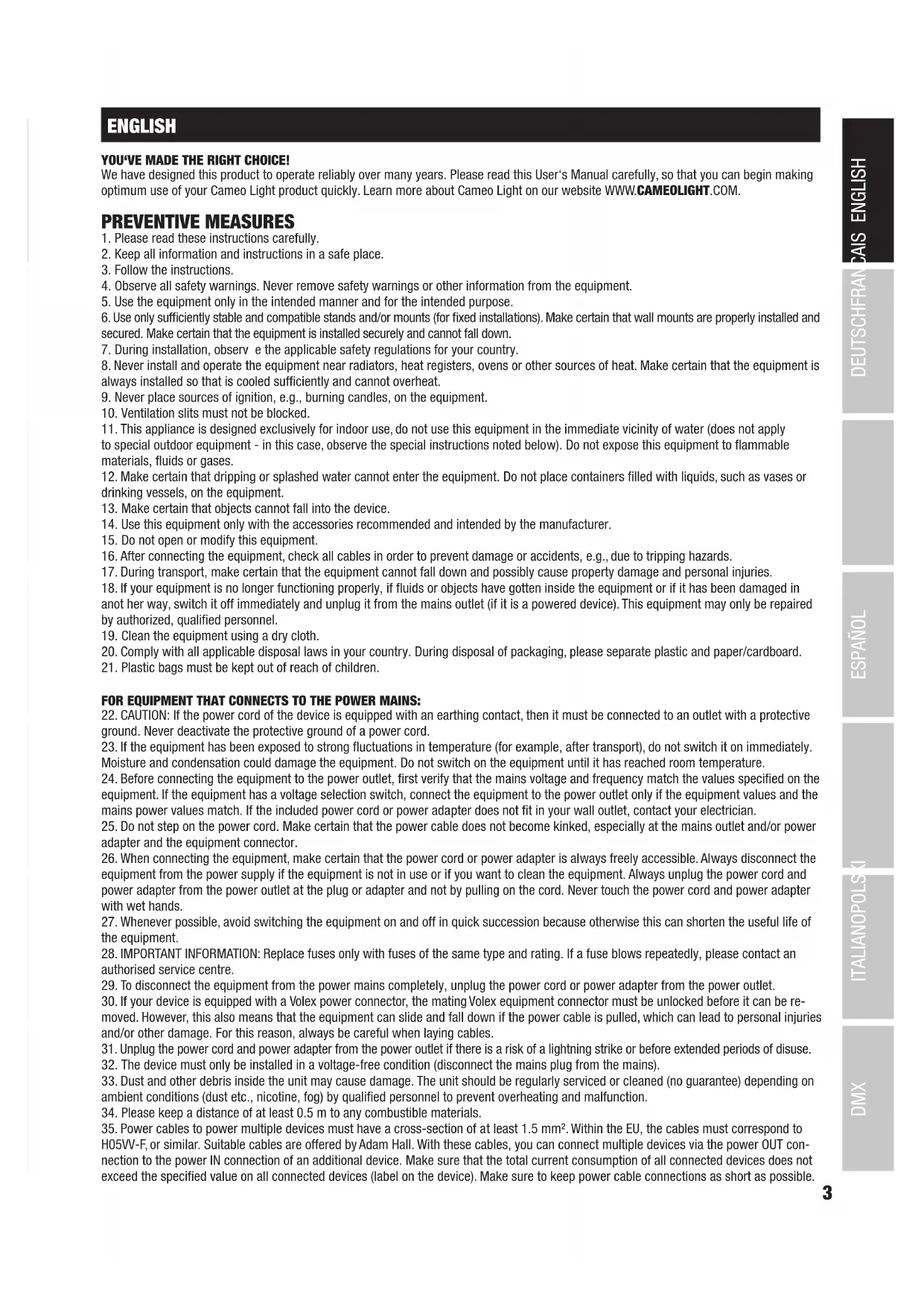 CONTROLLO DMX 1113 DMX DEUTSCHFRANCAIS ESPAÑOL ENGLISH ITALIANO POLSKI ENGLISH YOU‘VE MADE THE RIGHT CHOICE! We have designed this product to operate reliably over many years. Please read this User‘s Manual carefully, so that you can begin making optimum use of your Cameo Light product quickly. Learn more about Cameo Light on our website WWW.CAMEOLIGHT.COM. PREVENTIVE MEASURES