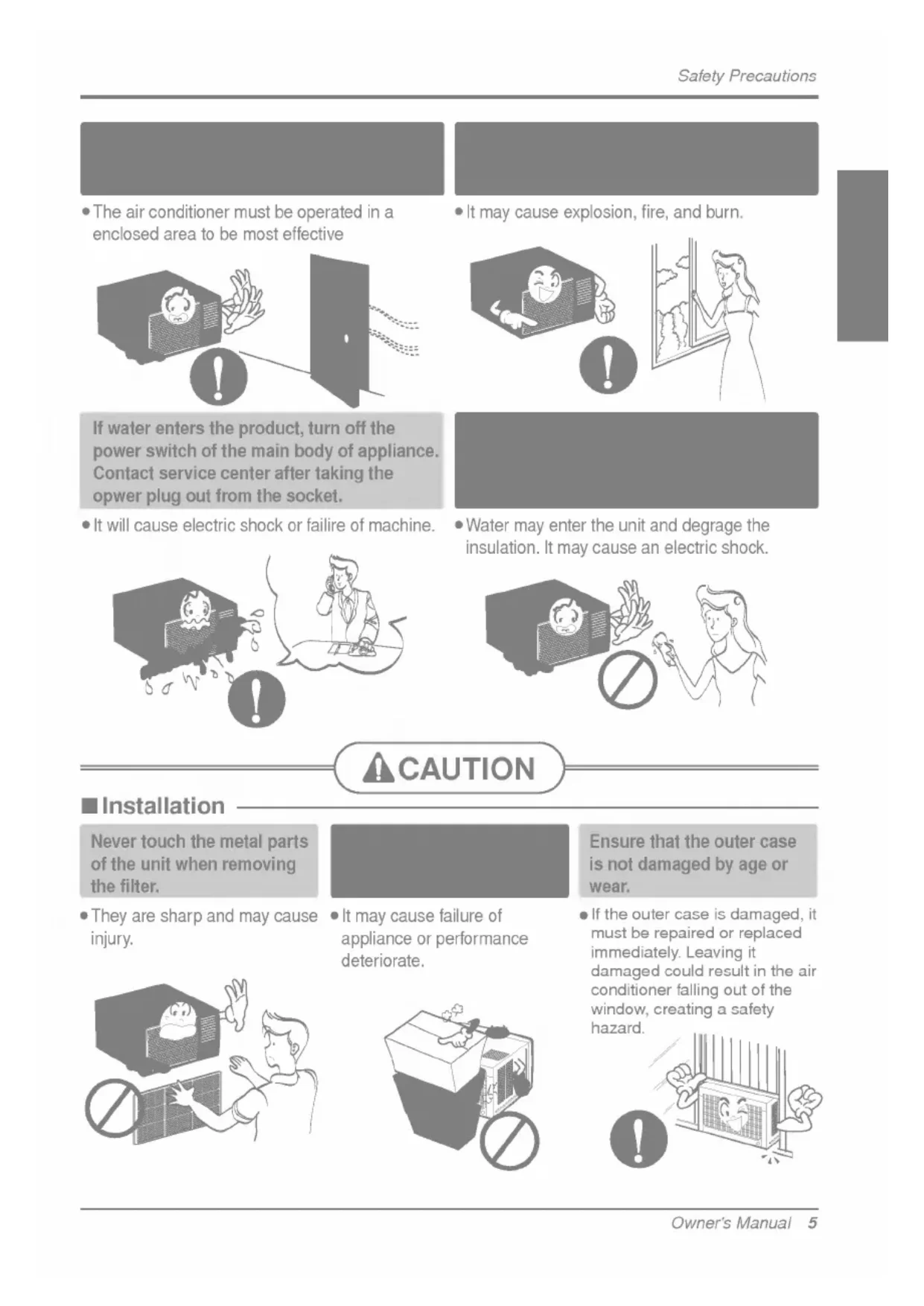 damp environment. Itwillcauseelectricshock.Owner'sManual5 CAUTION Safety Precautions Installation Nevertouchthemetal parts oftheunitwhen removing thefilter. They are sharp andmaycause injury. Donotblocktheinlet outlet.Itmaycausefailureof appliance performance deteriorate.Ensurethattheouter case isnot damaged