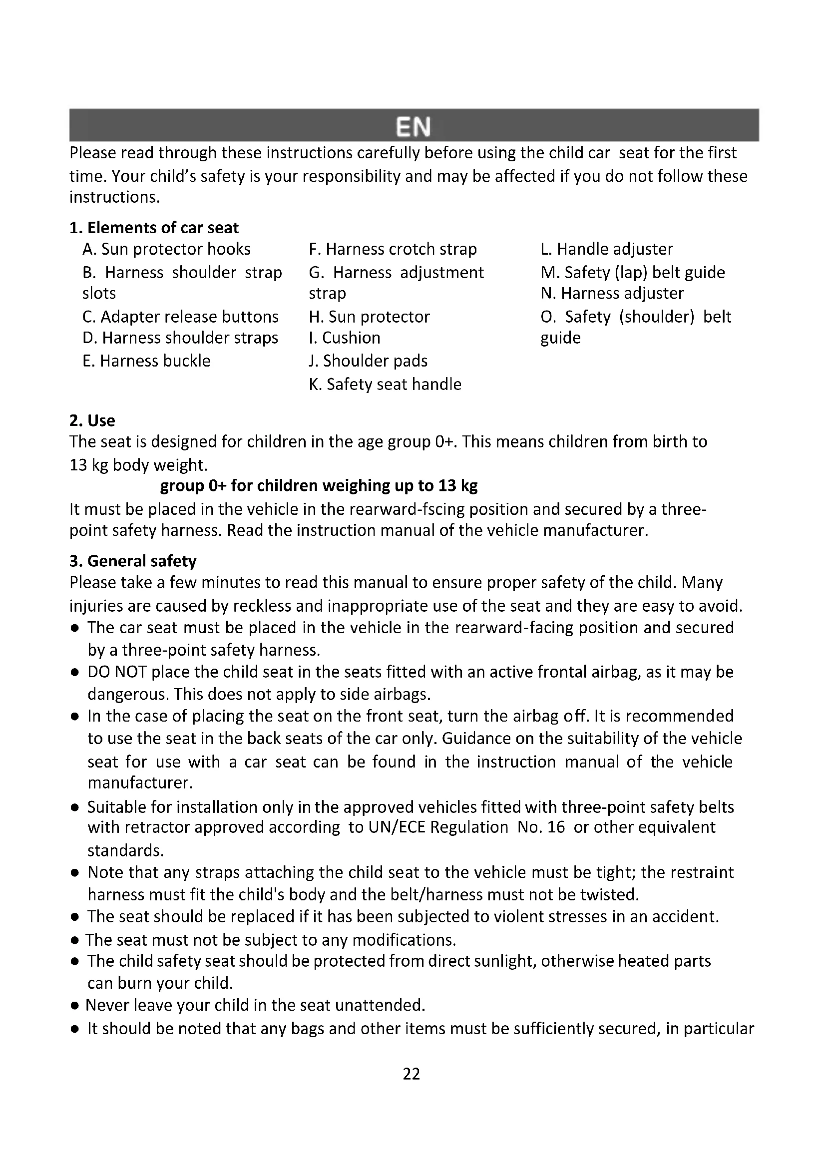 Please take a few minutes to read this manual to ensure proper safety of the child. Many injuries are caused by reckless and inappropriate use of the seat and they are easy to avoid. ● The car seat must be placed in the vehicle in the rearward-facing position and secured by a three-point safety harness. ● DO NOT place the child seat in the seats fitted with an active frontal airbag, as it may be dangerous. This does not apply to side airbags. ● In the case of placing the seat on the front seat, turn the airbag off. It is recommended to use the seat in the back seats of the car only. Guidance on the suitability of the vehicle seat for use with a car seat can be found in the instruction manual of the vehicle manufacturer. ● Suitable for installation only in the approved vehicles fitted with three-point safety belts with retractor approved according to UN/ECE Regulation No. 16 or other equivalent standards. ● Note that any straps attaching the child seat to the vehicle must be tight; the restraint harness must fit the child's body and the belt/harness must not be twisted. ● The seat should be replaced if it has been subjected to violent stresses in an accident. ● The seat must not be subject to any modifications. ● The child safety seat should be protected from direct sunlight, otherwise heated parts can burn your child. ● Never leave your child in the seat unattended. ● It should be noted that any bags and other items must be sufficiently secured, in particular23 on the parcel shelf, as otherwise in the event of a collision this can lead to injury. ● The seat cannot be used without the cover. ● Do not use replacement covers other than those recommended by the manufacturer, since it is an integral part of the safety seat. ● It is recommended to keep the car seat instruction manual for the entire period of its use. ● Do not use anchorages other than those described in the instruction manual and marked in the child seat. ● All rigid items and plastic parts of the child seat must be located and installed in such a way to avoid, under normal operating conditions of the vehicle, blocking by a sliding seat or vehicle door. ● Regularly check the technical condition of the harness, paying special attention to the fasteners/holders, seams and adjustment elements. ● Discontinue use of the car seat if its parts are damaged or loosened. ● In case of an emergency situation, it is important to quickly unfasten the seat belts. This means that the harness release button is not fully secured; make sure that your child does not play with the buckle. ● Make sure that the belt is properly placed in the guides. The safety belt buckle must be below the belt guide (Fig. 1 M). ● You should give your child a good example and always fasten your belts. An adult with unfastened safety belts may also be a threat to the child. ● Before each trip by car, make sure that the seat is properly secured. ● The car seat must be protected even when not in use. Unattached seat can cause injuries to passengers even during emergency braking. ● Caution! Do not place the seat on platforms such as a table, countertop, bed, etc. due to a risk of falling.